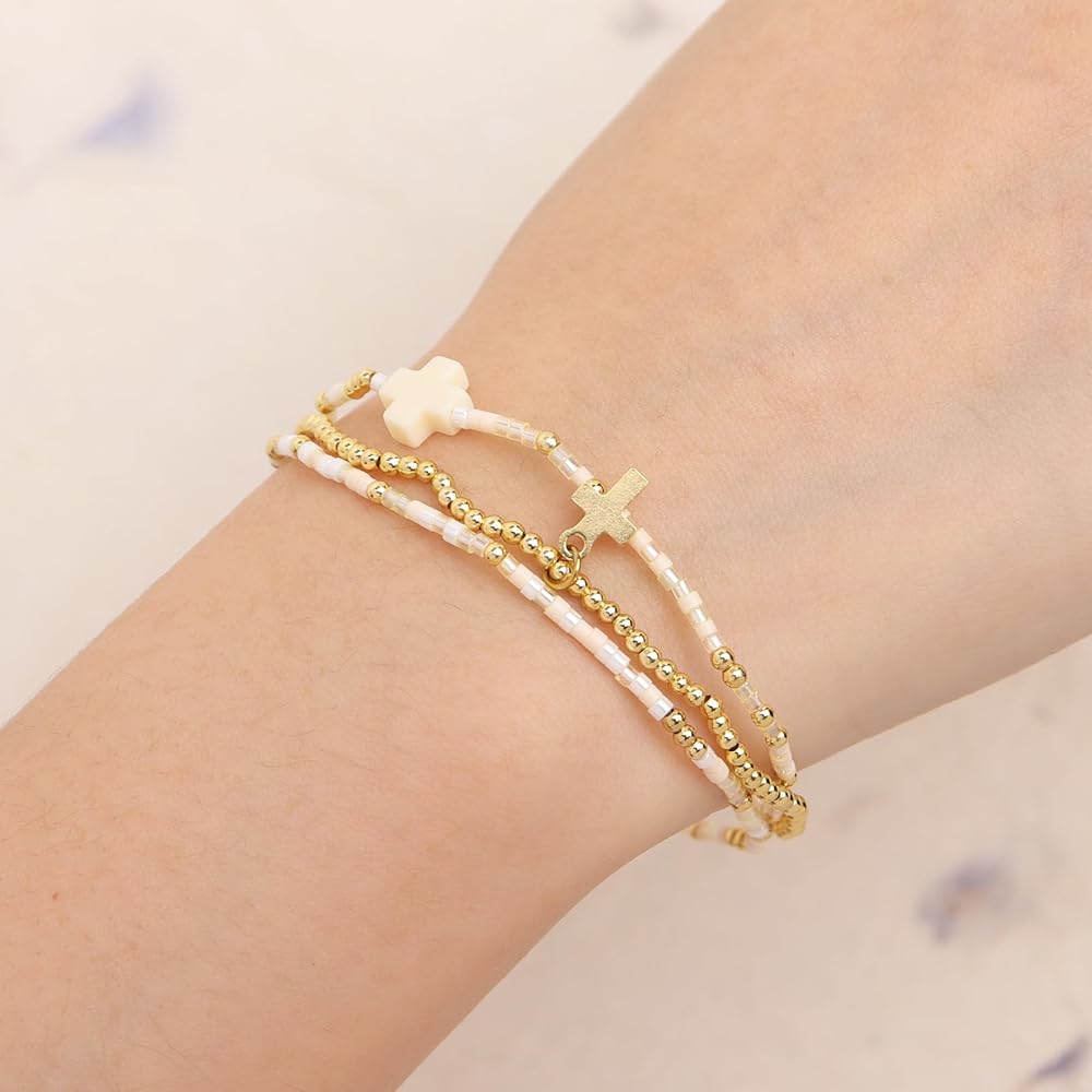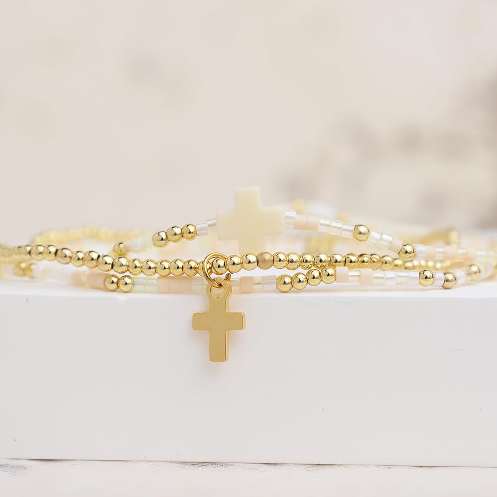 Cross Beads Stack Bracelets Set for Women, Boho Handmade Gold Beaded Stackable Charm Stretch Festive Holiday Accessories Jewelry Gift.