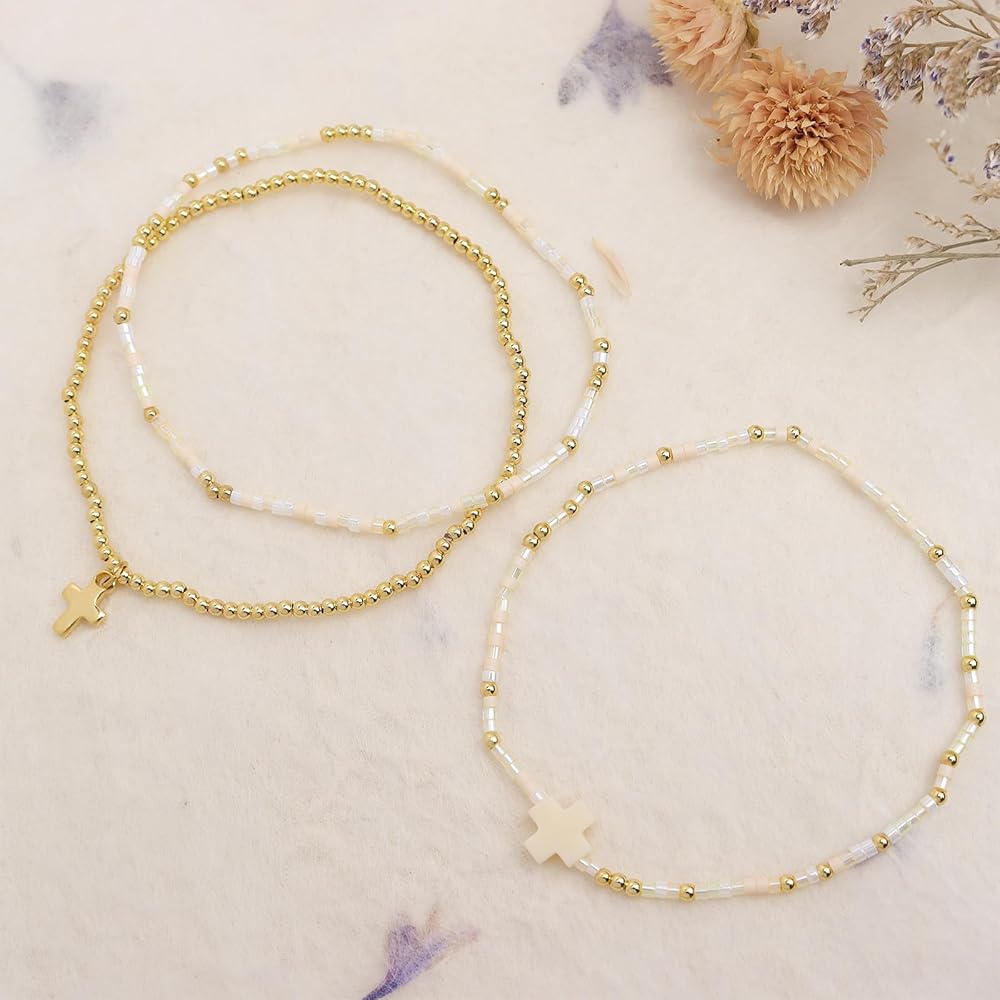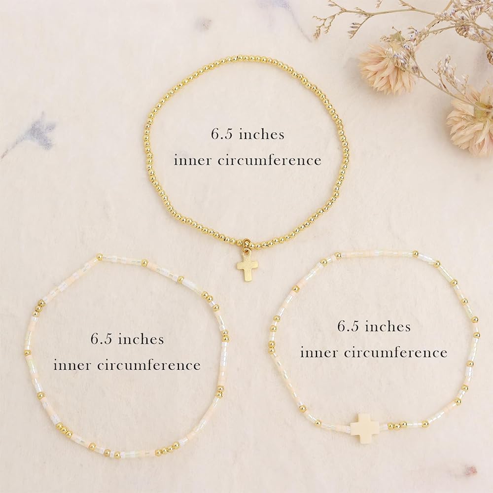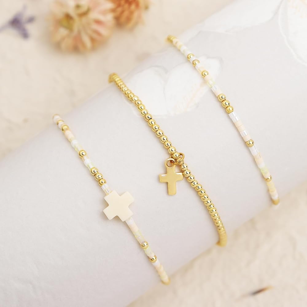 • Cross seed beads bracelets set, 3Pcs stretch bangle set, including 2 tiny beaded bracelet and 1 dainty gold beaded, with lovely eye-catching colors and a fashion gold cross charm.