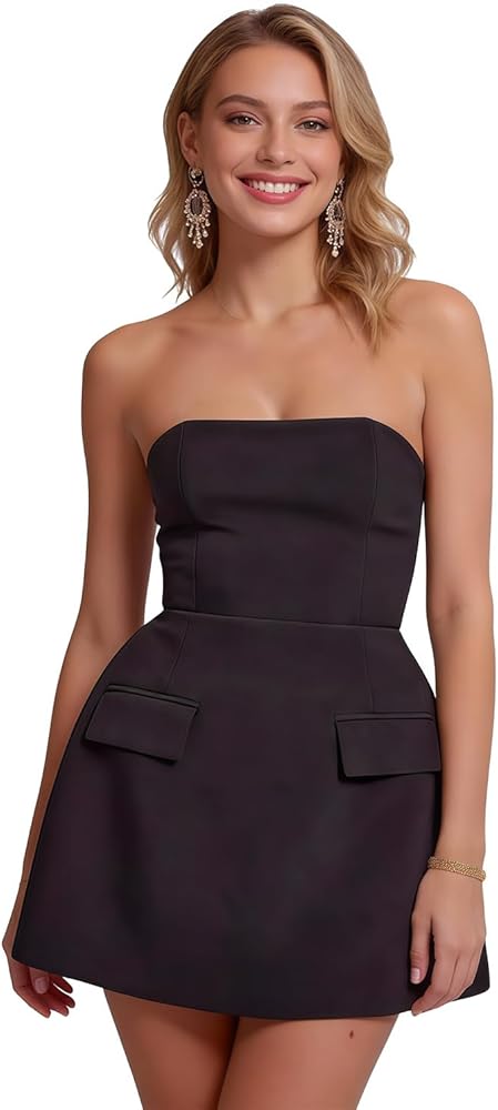 Our women's sleeveless A lined mini dress accentuates your figure, making you feel confident and sexy. Featuring pockets decorations and strapless tube design that adds a touch of glamour and elegance to your look