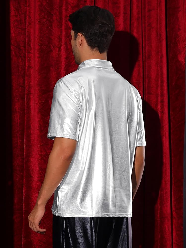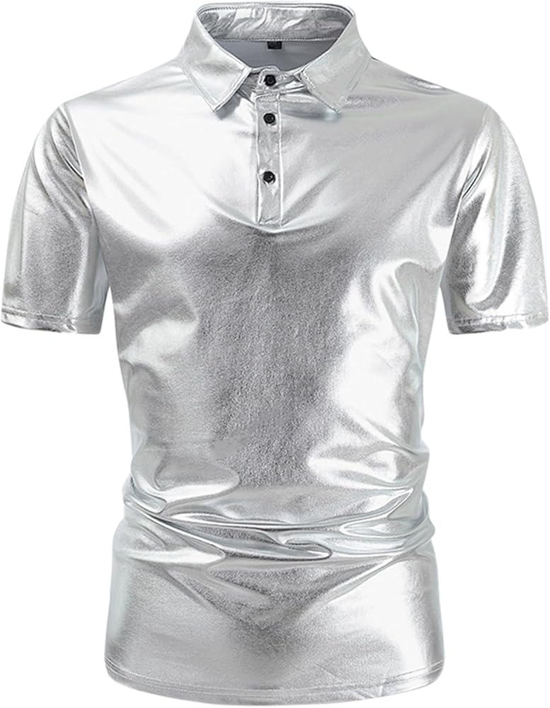 Lars Amadeus Polo Shirt for Men's Shiny Metallic Short Sleeves Sparkle Club Party 70s Disco T-Shirts