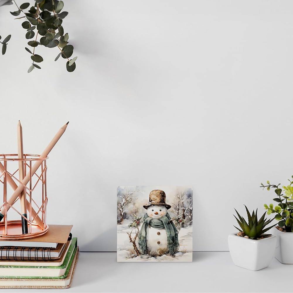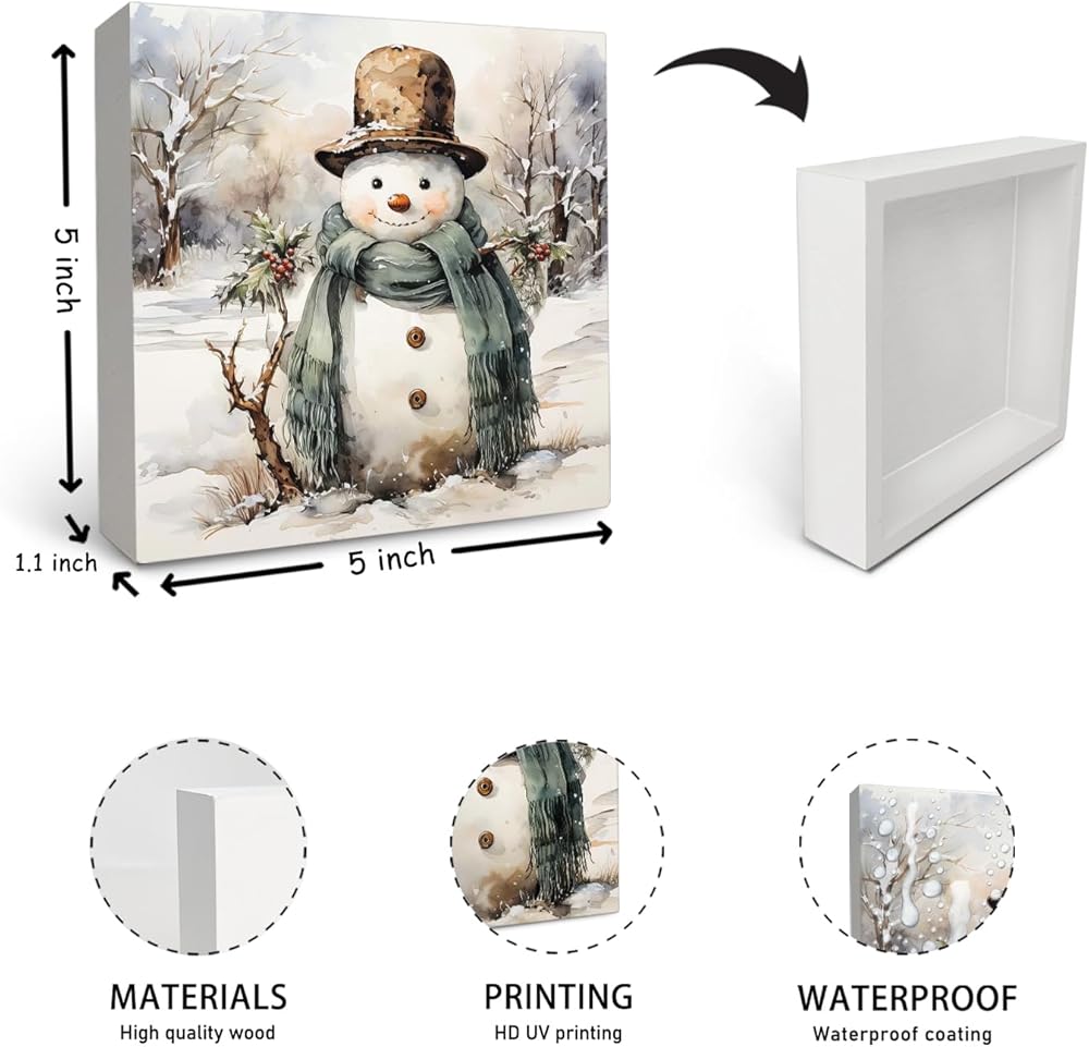 OFlich Vintage Snowman Wooden Box Sign, Rustic Winter Snowman Sign for Home Office Desk Table Shelf Decor, Winter Home Decor, 5x5 Inch