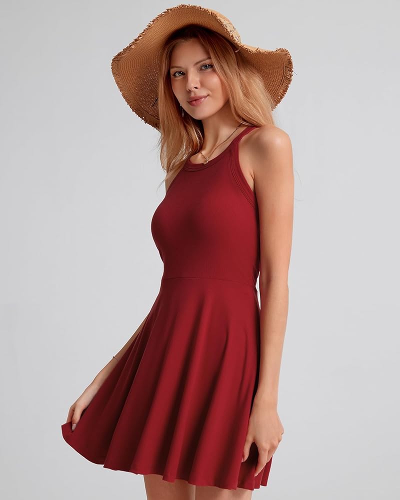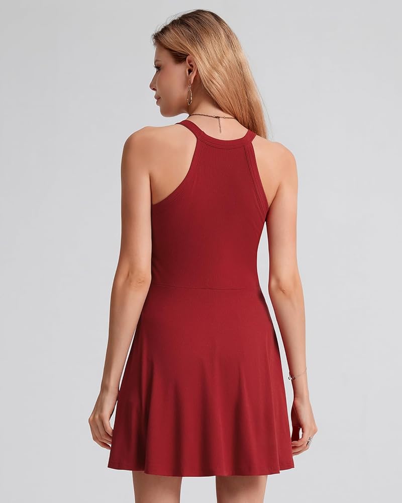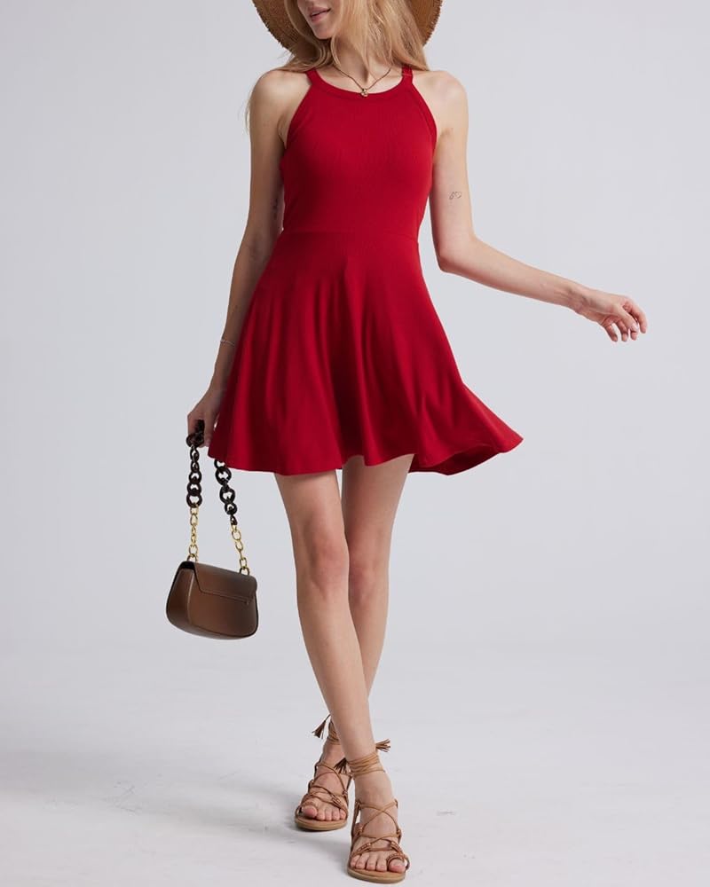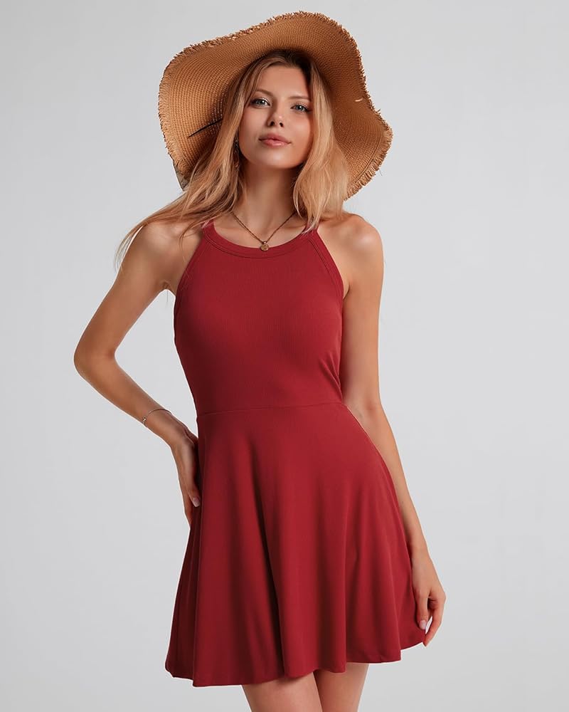 Style - halter mini dress, beach dress, tank dress, skater dress, swing dress, A-line, fit and flare, halter, ribbed fabric.