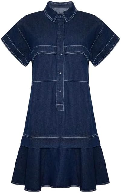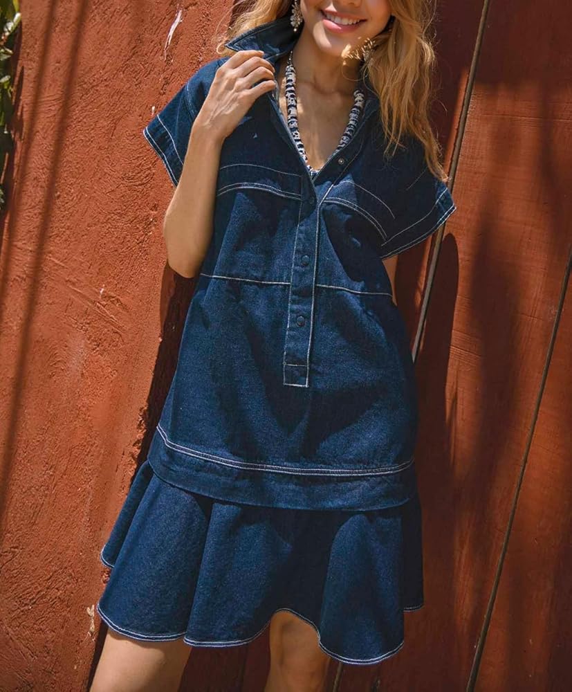 【Function Design】Shirt collar, drop waist, hidden buttons on front, short sleeves, side pockets, mini length, loose fit, women's 2024 summer baby doll dress.