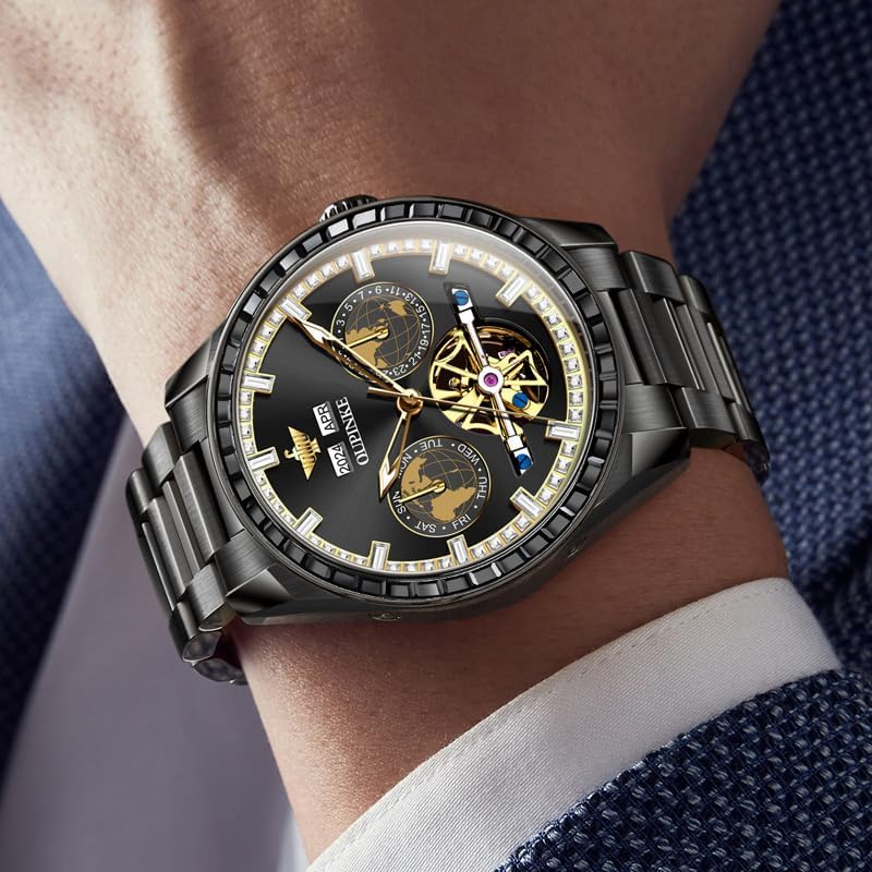 ⌚【Automatic Timepiece】 This formal men's automatic watch boasts a distinctive design, featuring a fully skeletonized dial, exuding a sophisticated and masculine charm. The case incorporates a friction drawing technique, adding a touch of finesse that makes it an essential accessory for any gentleman on the go, whether for business trips or leisurely excursions.