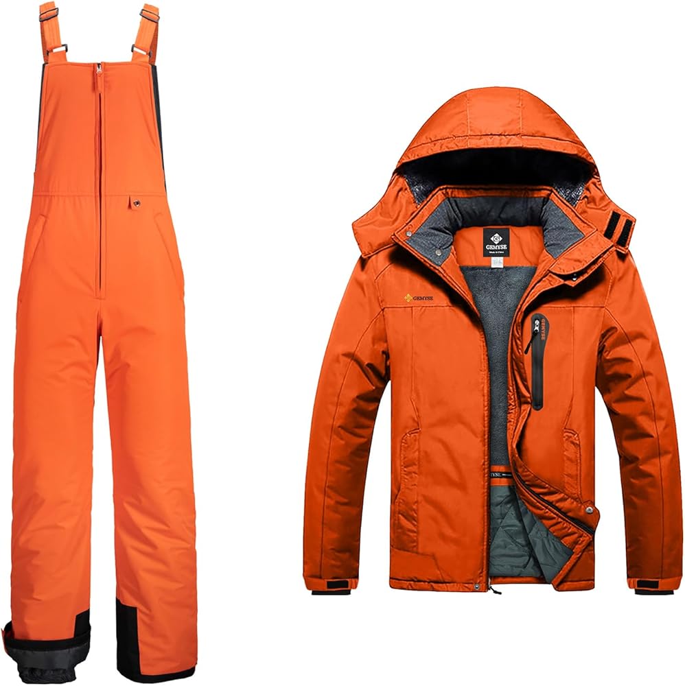 GEMYSE Men's Mountain Waterproof Ski Snow Jacket Winter Windproof Rain Jacket+Ski Bibs(Orange,Medium)