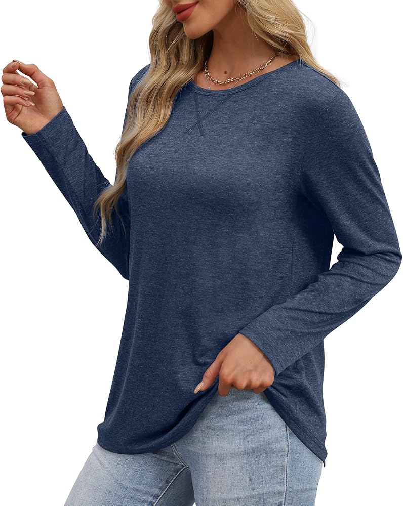 【Features】: Long Sleeve Shirts / Classic Round Neck / Loose Fit / Solid Colors / Essential Wardrobe Staples.The timeless round neck and relaxed, elastic fit ensure a versatile silhouette that effortlessly transitions through seasons. Elevate your everyday look effortlessly
