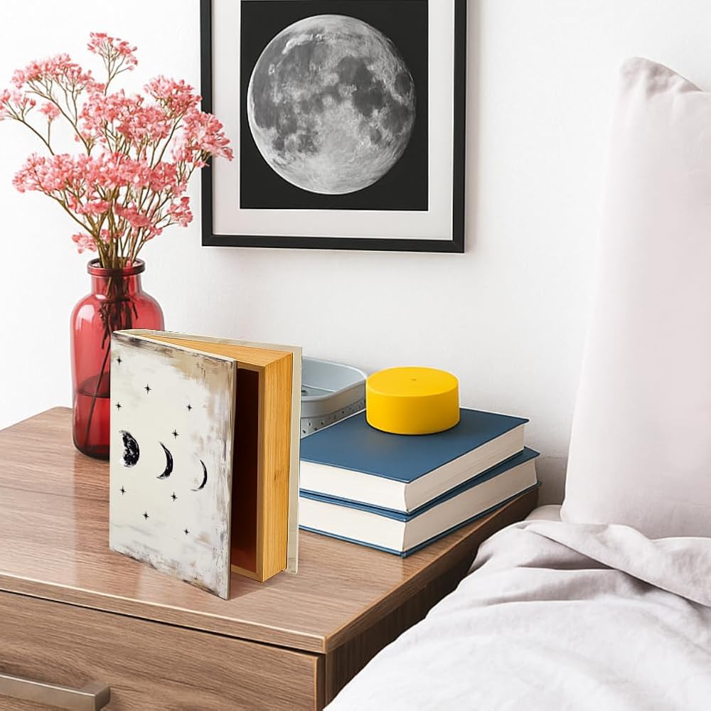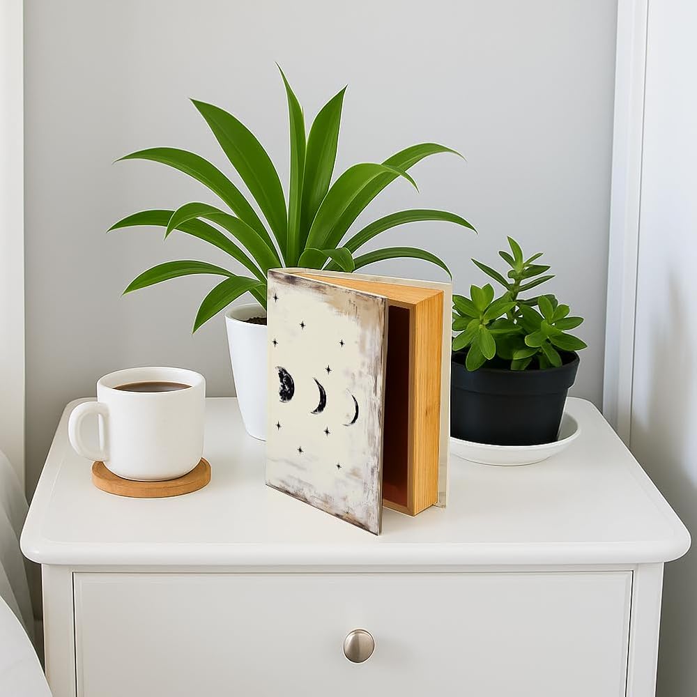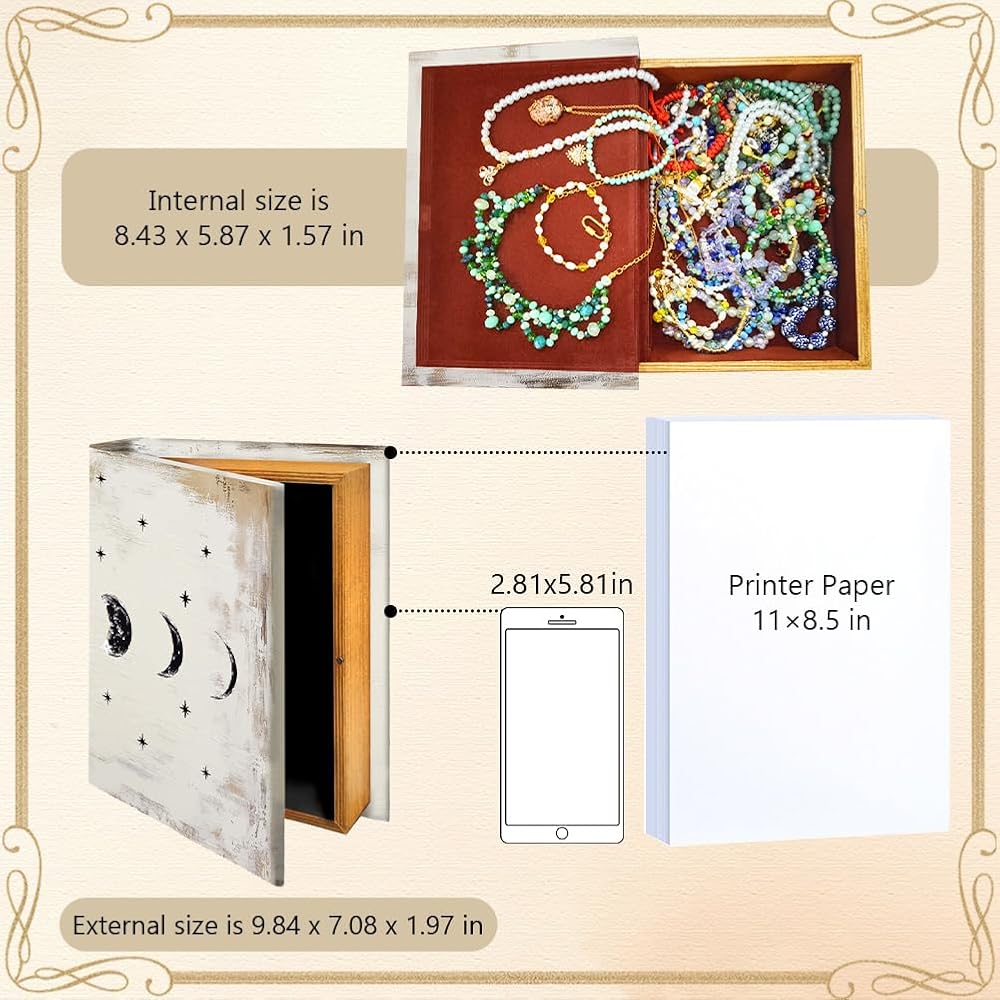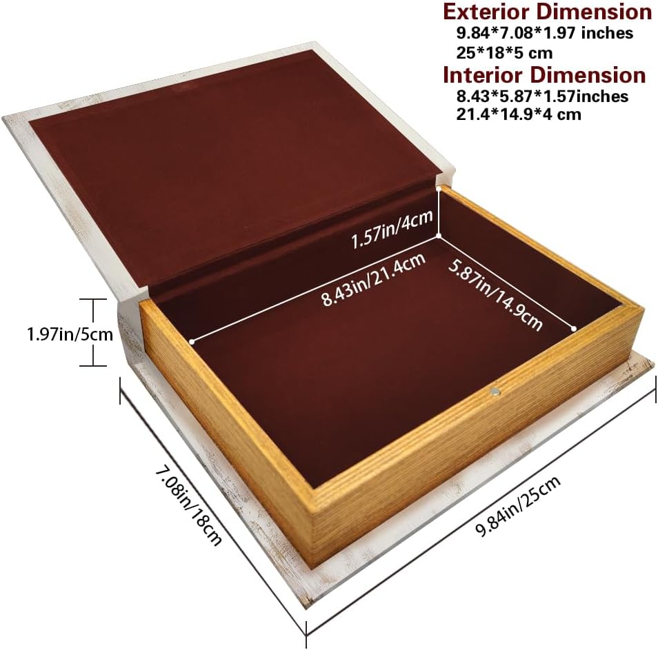 SPACIOUS AND PRACTICAL: External size is 9.06" x 7.08" x 1.97" , internal size is 8.43" x 5.87" x 1.57", this book box provides ample storage space for storing trivial items or hiding secret letters.