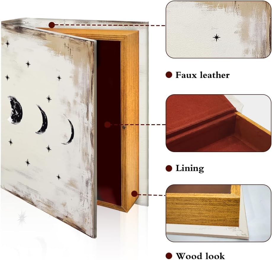 EXQUISITE BOOK BOX: This book box is made of high quality plywood material, with faux leather cover, non-woven lining and simulated book pages, which is well-made, realistic and stylish.