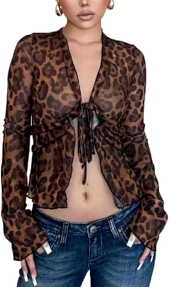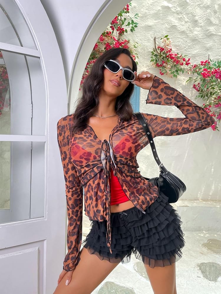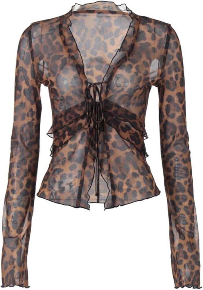 This sheer leopard print top adds a bold touch to any outfit with its lightweight chiffon material, tie-front closure, and ruffled details Designed to showcase a daring and stylish look, it's perfect for layering over a bralette or pairing with high-waisted jeans