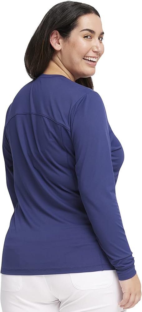 The woman underscrub Knit Tee from the Infinity collection offers a soft, comfortable, and stylish option for healthcare professionals seeking a reliable base layer. The Contemporary fit ensures a flattering silhouette, while the round neckline and knit cuffs provide a snug, cozy feel. Made from a blend of 95% polyester and 5% spandex knit, this tee offers the perfect balance of stretch and durability, allowing for ease of movement during busy workdays. Designed with practicality in mind, the tee features a shaped back yoke and back princess seams, enhancing its fit and giving it a polished look. The rounded hem adds a touch of style, making this underscrub tee suitable for both work and casual wear. With a center back length of 25 1/2", it provides ample coverage while maintaining a sleek appearance. This woman's underscrub tee is perfect for layering under scrubs or other workwear, as it is designed without chest pockets to ensure a smooth, streamlined fit. The absence of pockets also eliminates bulk, making it comfortable to wear under additional layers. Caring for the womans underscrub tshirt is simple and hassle-free. It is machine washable in cold water with similar colors, and can be tumble dried on low heat. If needed, a cool iron can be used to maintain its appearance, ensuring that it remains in top condition even after multiple washes. As part of the Infinity collection, this tee is manufactured with high-quality imported materials, ensuring long-lasting performance and comfort. The durable polyester and spandex blend, combined with advanced design features like the shaped back yoke and back princess seams, make the Long Sleeve Underscrub Knit Tee an essential addition to any healthcare professional's wardrobe.