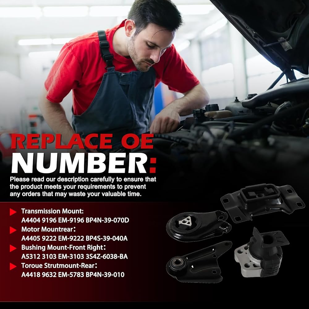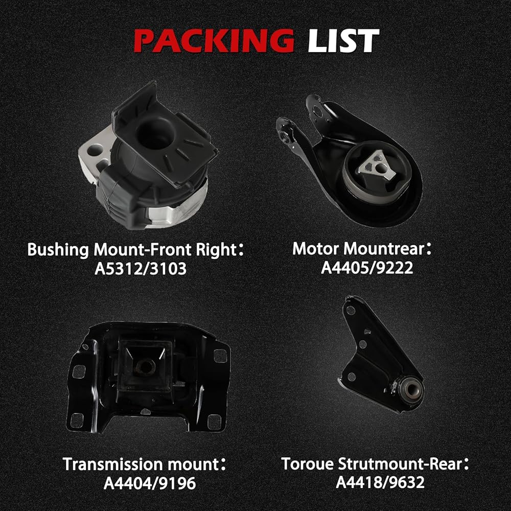 【Replacement Part Number】 — Automotive replacement engine mounts Tailored precisely to your vehicle, this kit includes parts A4509, A4516, A4510 , A4517, A4526HY, A4544, A4591. The straightforward design enables quick, direct replacement of worn or aging mounts.