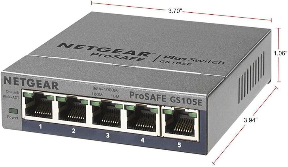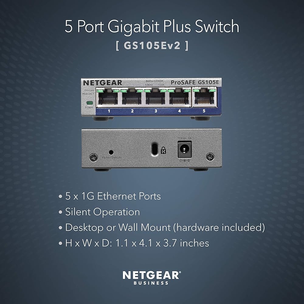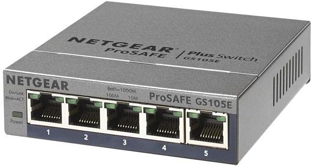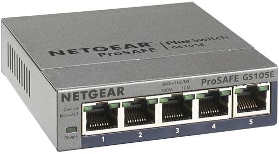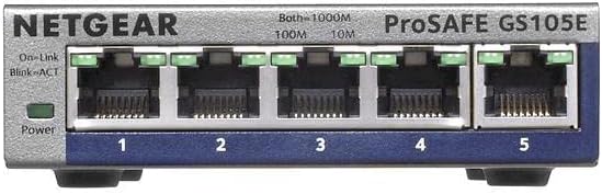 The NETGEAR GS105 ProSafe 5-Port Gigabit Ethernet Desktop Switch offers:Five gigabit ports for fast data transfers.