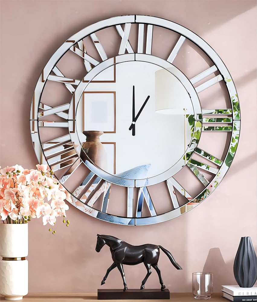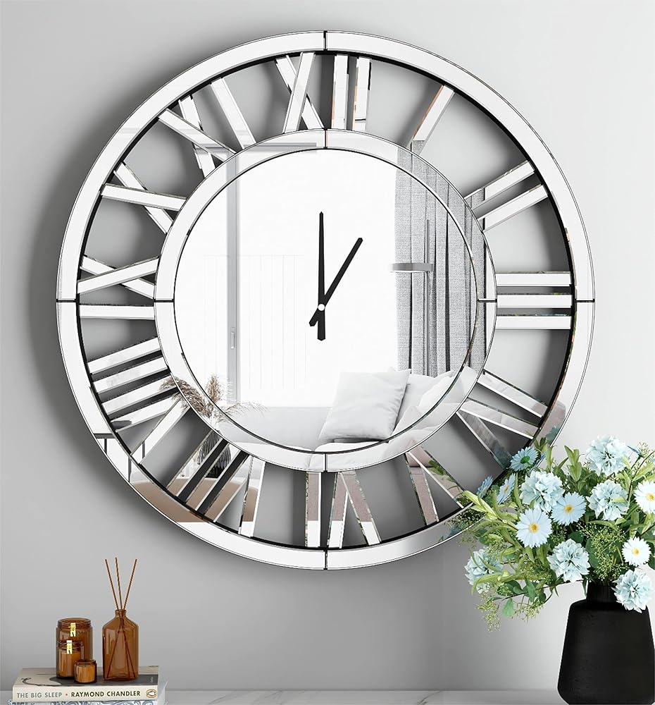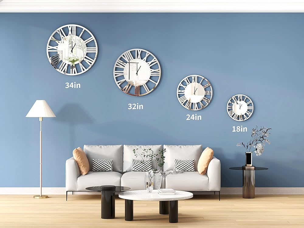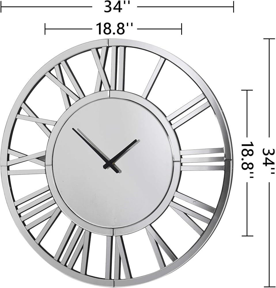 SHYFOY 34" Oversize Wall Clock Living Room Decor, Extra Large Decorative Mirror Wall Clocks, Silver Wall Decor Big Clocks Modern Roman Numerals Home Decor, Acrylic Mirror Finish