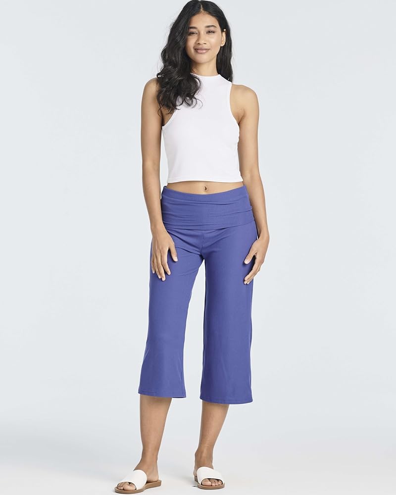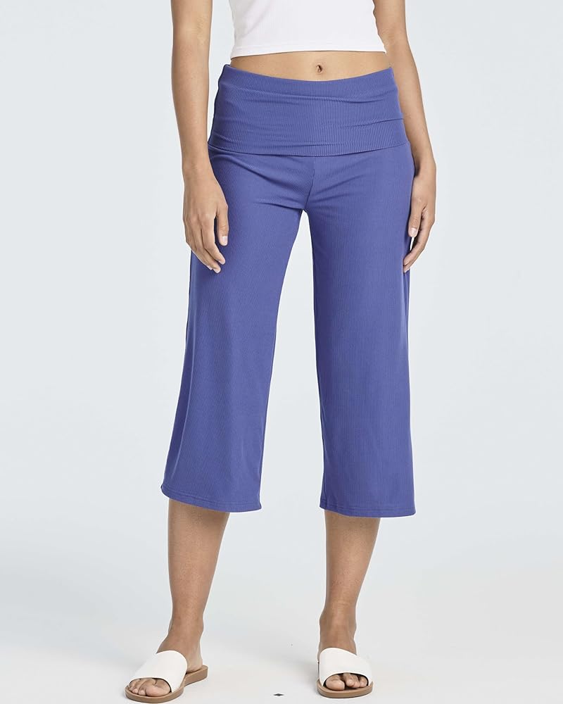Revamp your casual wear with our Women's Wide Leg Capri Pants, designed to provide a blend of comfort and style. These capris feature a fashionable wide leg design, making them perfect for both lounging at home and practicing yoga. The capri length is just right for warmer seasons, giving you a relaxed yet stylish appearance with a boho and palazzo flair, and a foldover waistband. The elastic foldover waistband offers a comfortable fit, ensuring freedom of movement during any activity. Crafted from premium ribbed fabric, these women's capris are breathable and easy to wear for extended periods. Whether you're unwinding on a laid-back afternoon, running errands, or engaging in light workouts, these wide leg capri pants are the perfect choice for versatile comfort. Embrace comfort and style with these capris, the ideal addition to your casual and active wardrobe, featuring a boho and palazzo style with a foldover waistband.