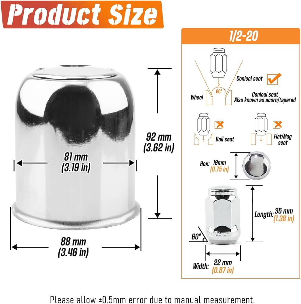 4-Pack Trailer Push Through Center Caps and Trailer Wheel Lug Sets - 3.19in Wheel Center Caps Chrome Wheel Cover Carbon Steel Hub Cap with 24 Chrome Capped 1/2-20 Lug Nuts for Truck RV