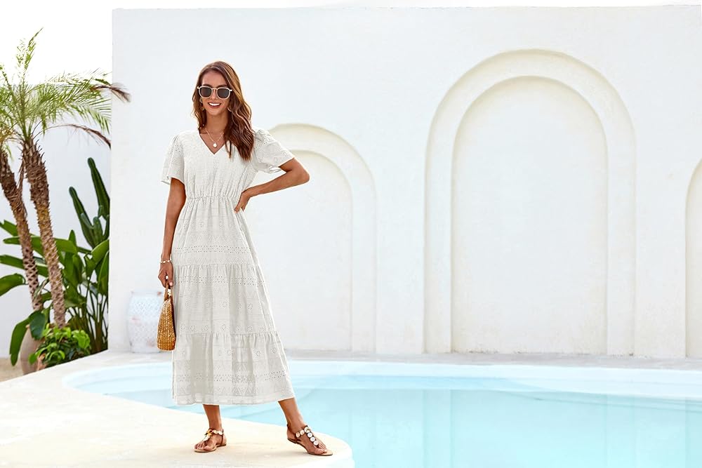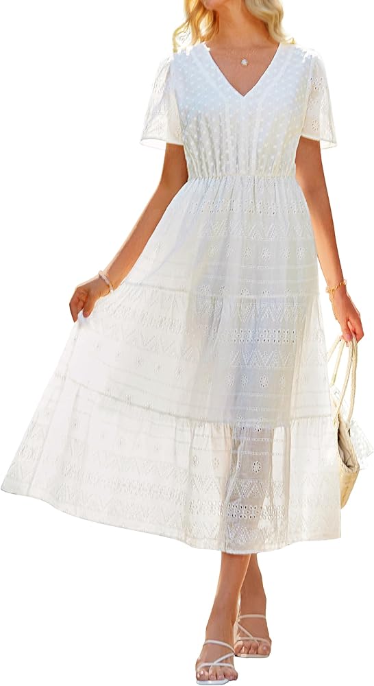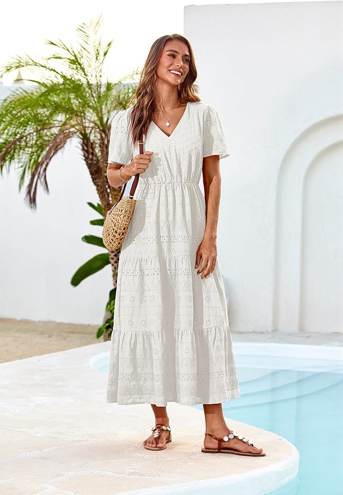 [Elegant Design]: This maxi dress features exquisite embroidery on a cotton base, offering a chic and timeless look. The elastic waistband provides comfort and enhances your silhouette, perfect for any body shape.
