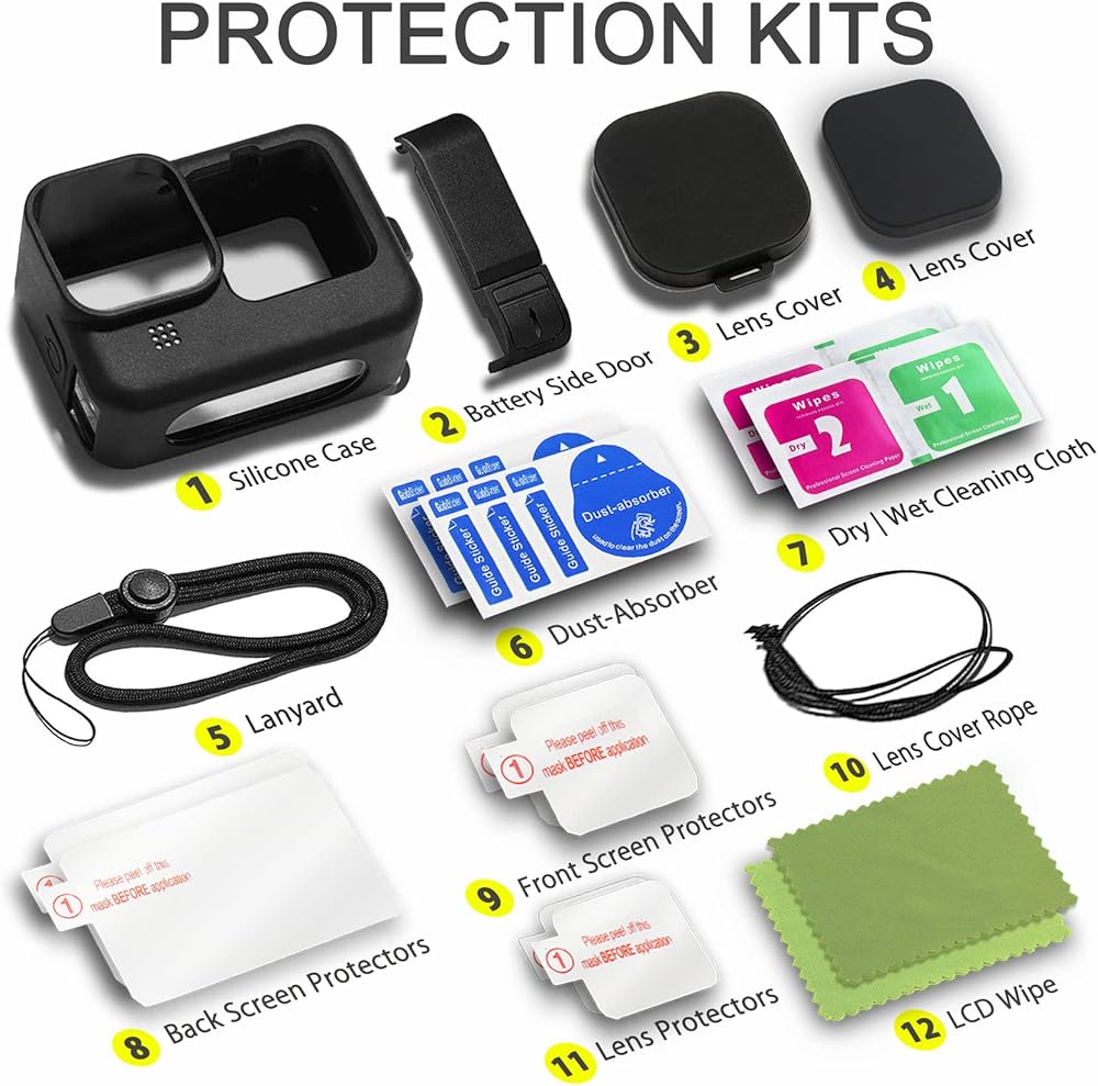 OKFUN Accessories Kit for Go Pro Hero 12/11/10/9 Black,Silicone Sleeve Protective Case with Rubber Lens Cover+Screen Protector+Battery Side Cover+Lens Cover Cap for Go Pro Hero12 Hero11 Hero10 Hero9