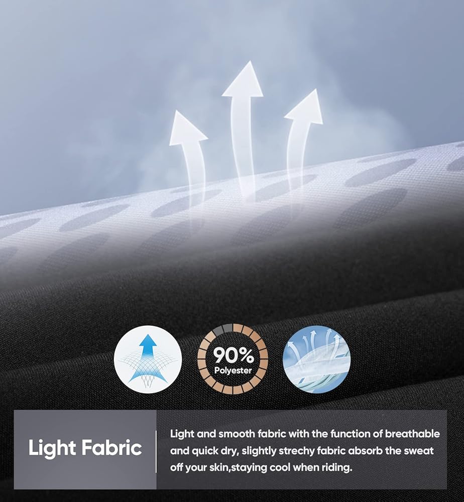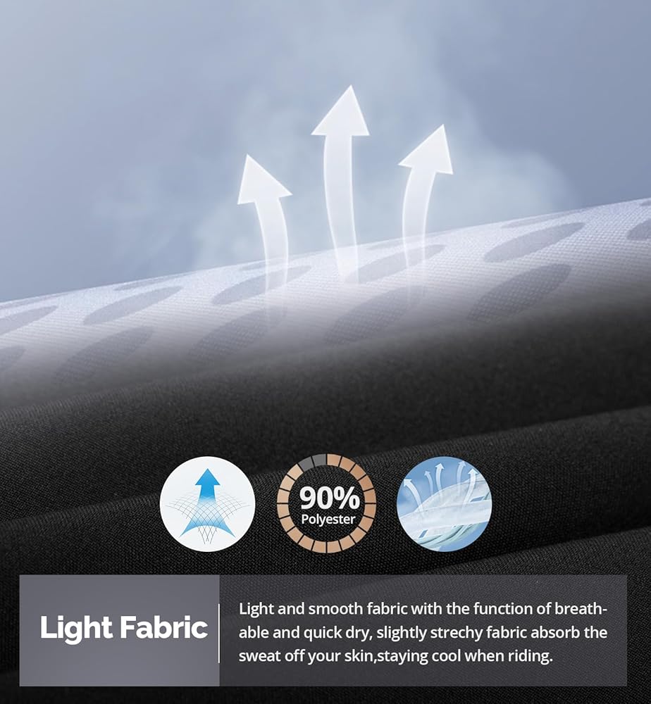Light Fabric: 90% Polyester, light and smooth fabric with the function of breathable and quick dry, slightly strechy fabric absorb the sweat off your skin,staying cool when riding