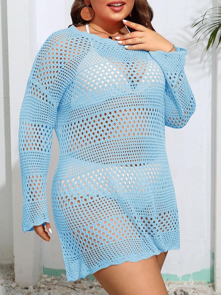 Feature: Plus size beach cover up features with long sleeve, hollow out, knitted fabric, mini length, loose fit, solid color, simple and fashionable style.