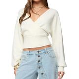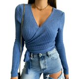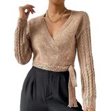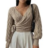 Feature: Knitted Crop Top sweater, V neck, Lantern Sleeve, Cropped Length, Cable Knit Blouses, solid color, drop shoulder, wrap tie front with belt