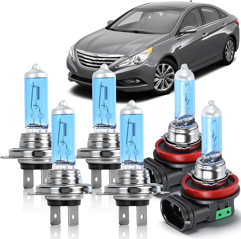 🚗【Compatibility Check Before Purchase】: Halogen Headlight Bulbs compatible with Hyundai Sonata 2011 2012 2013 2014. The Halogen headlight bulb combo includes H7 high beam and H7 low beam bulbs and H11 fog headlights totaling 6 in the package.