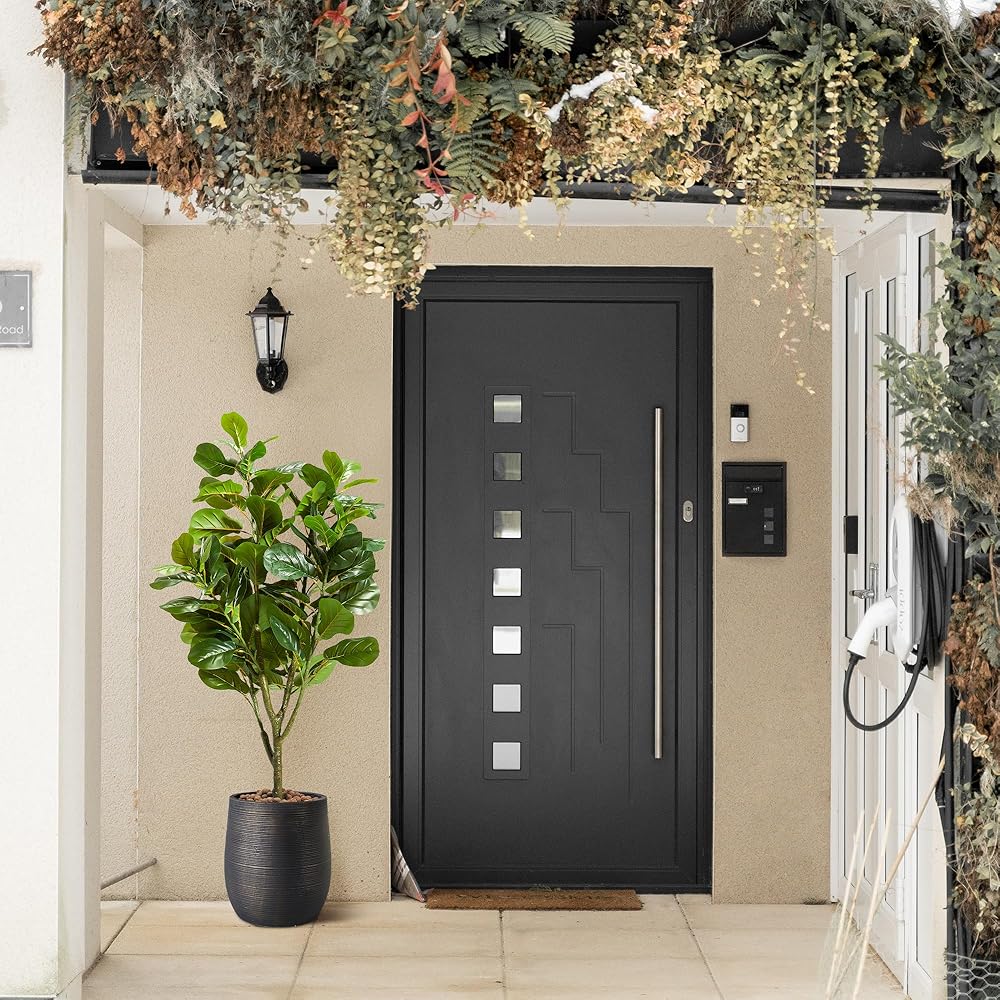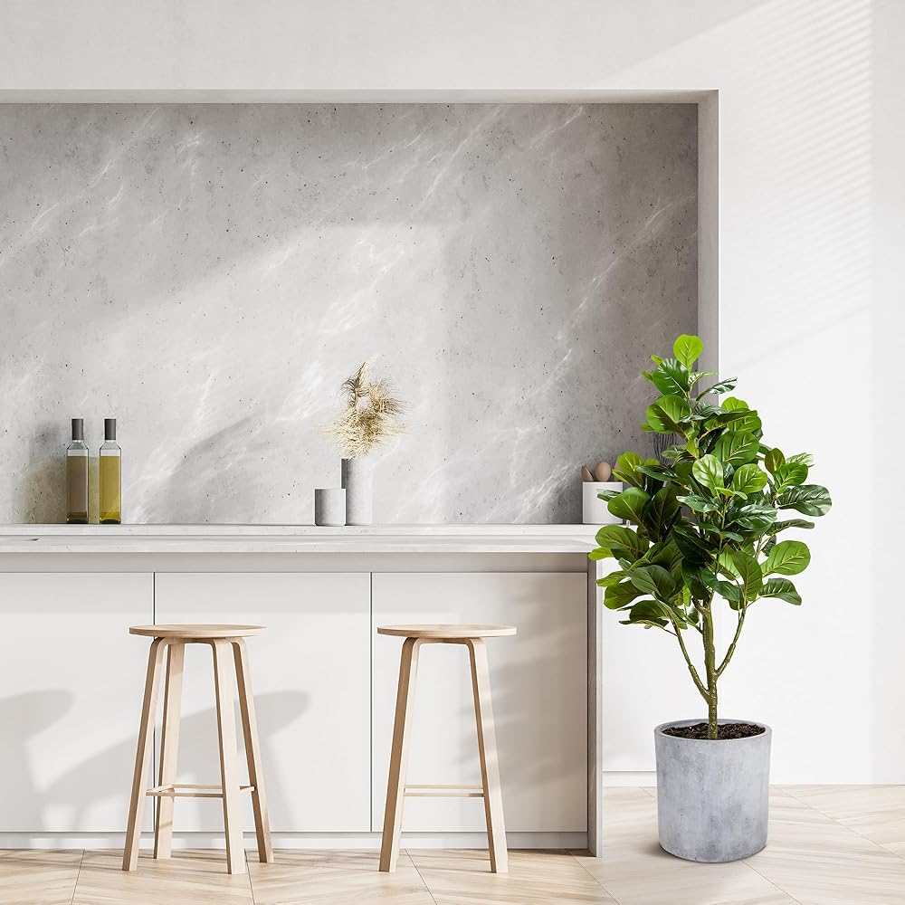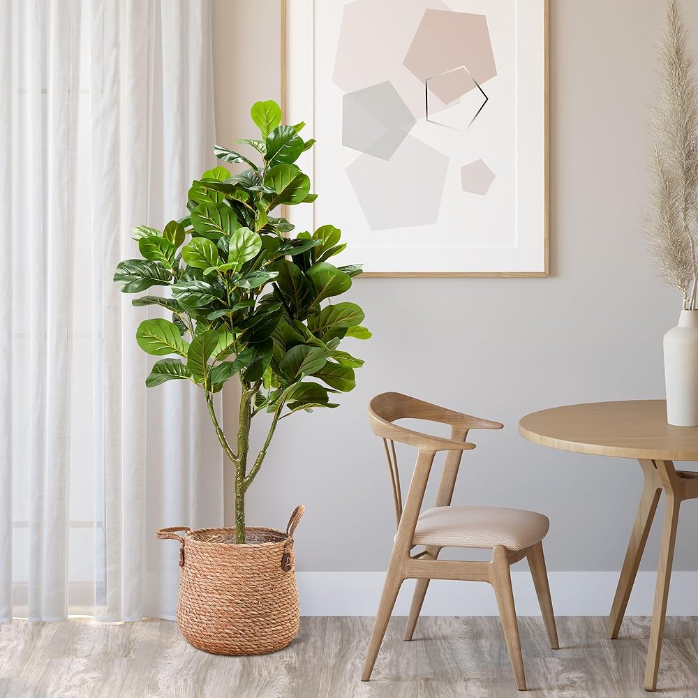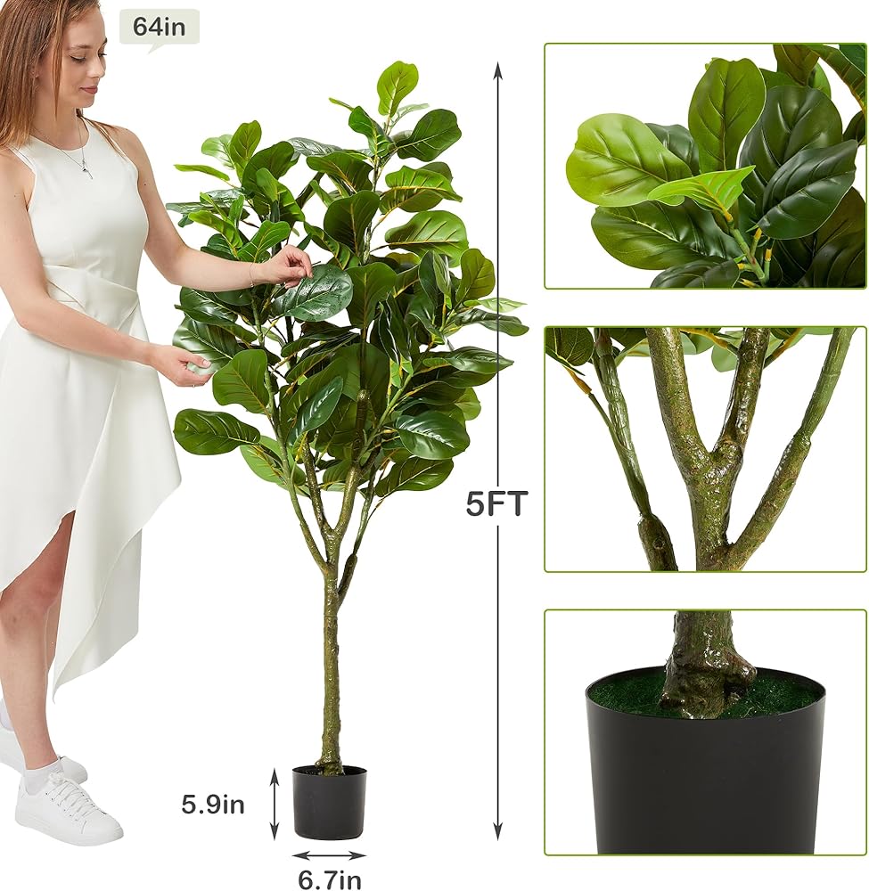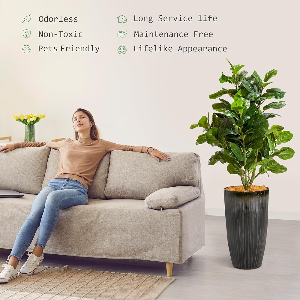 HIGH QUALITY SAFE MATERIAL: The realistic fiddle leaves are made of high-quality PEVA, which is more realistic, beautiful, and full of vitality than leaves made of other materials; The non-decorative pot is made of PP, with cement poured inside which ensures the overall stability
