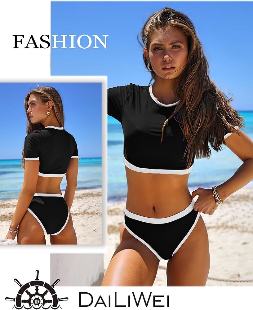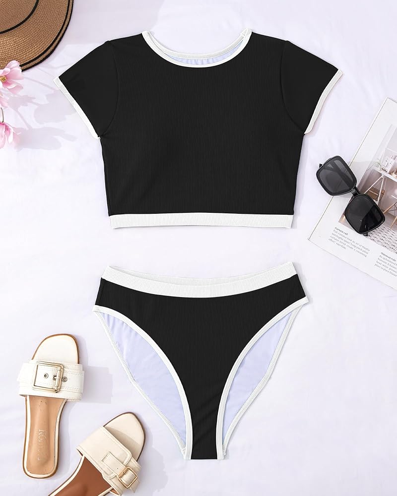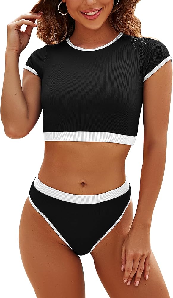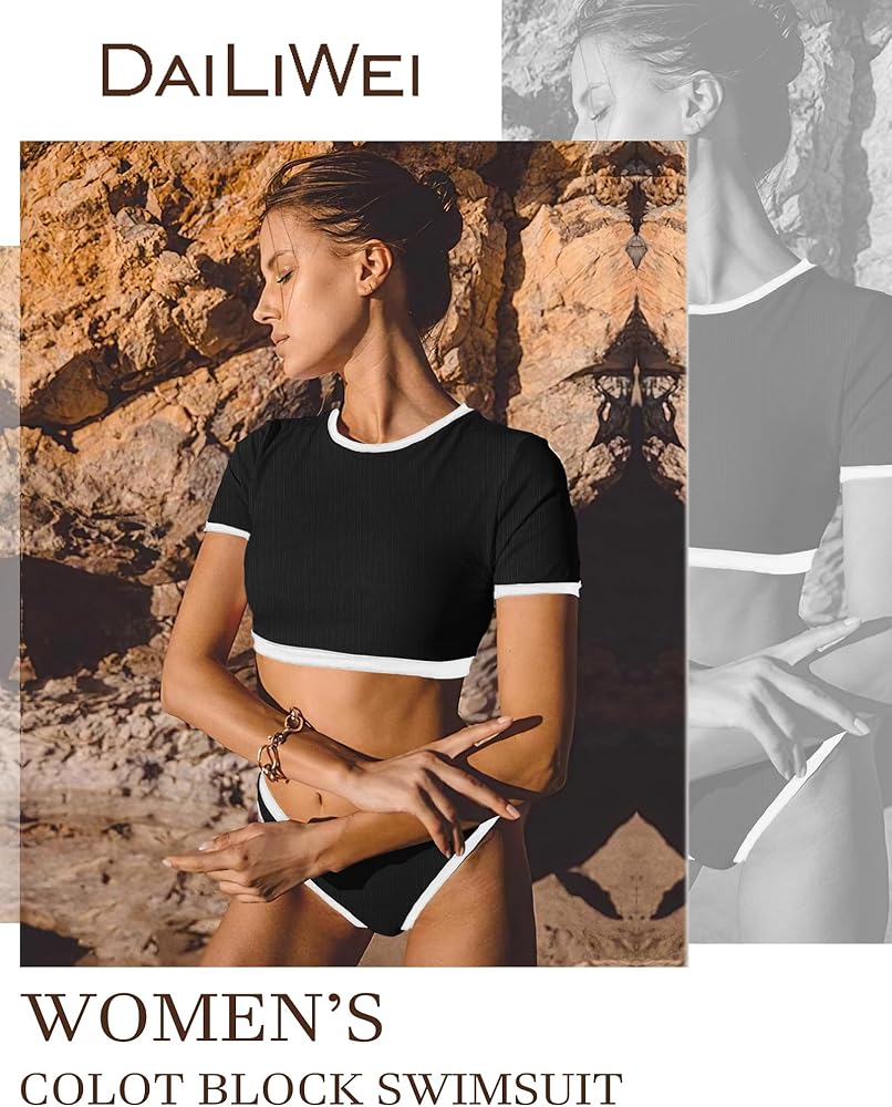 Colorblock Swimsuit Women--Womens color block bikini with vibrant color, offer special and beautiful style. Colorful swimwear can catch the eyes in beach instantly. Short sleeve bathing suit with crop top swimwear can pair with casual outfits