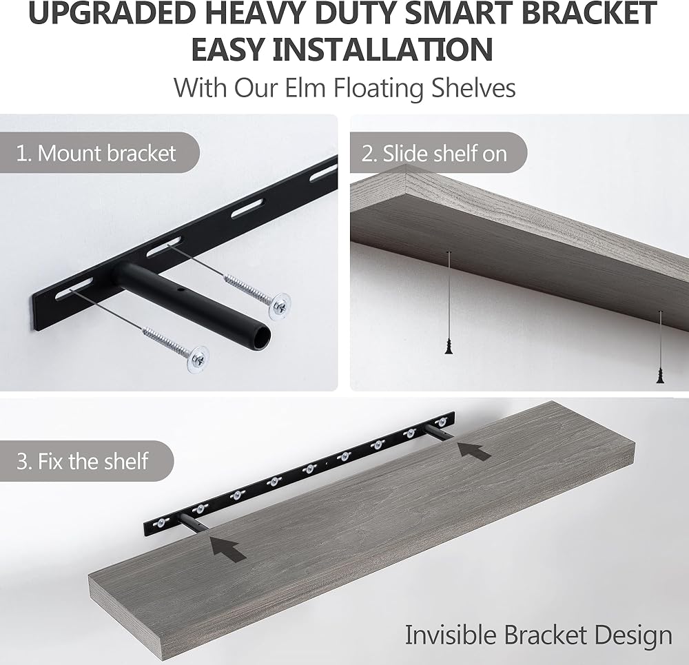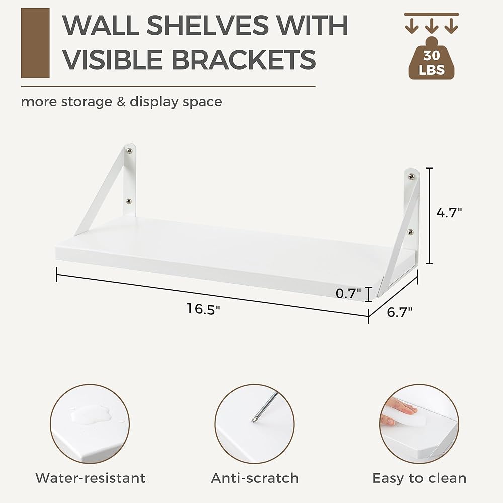 HEAVY-DUTY BRACKET SUPPORT: Our shelves are built for both style and strength. Sturdy metal brackets and precise screws securely hold the 0.7" thick MDF boards, supporting up to 30 lbs¡ªideal for displaying books, photos, collectibles, and more.
