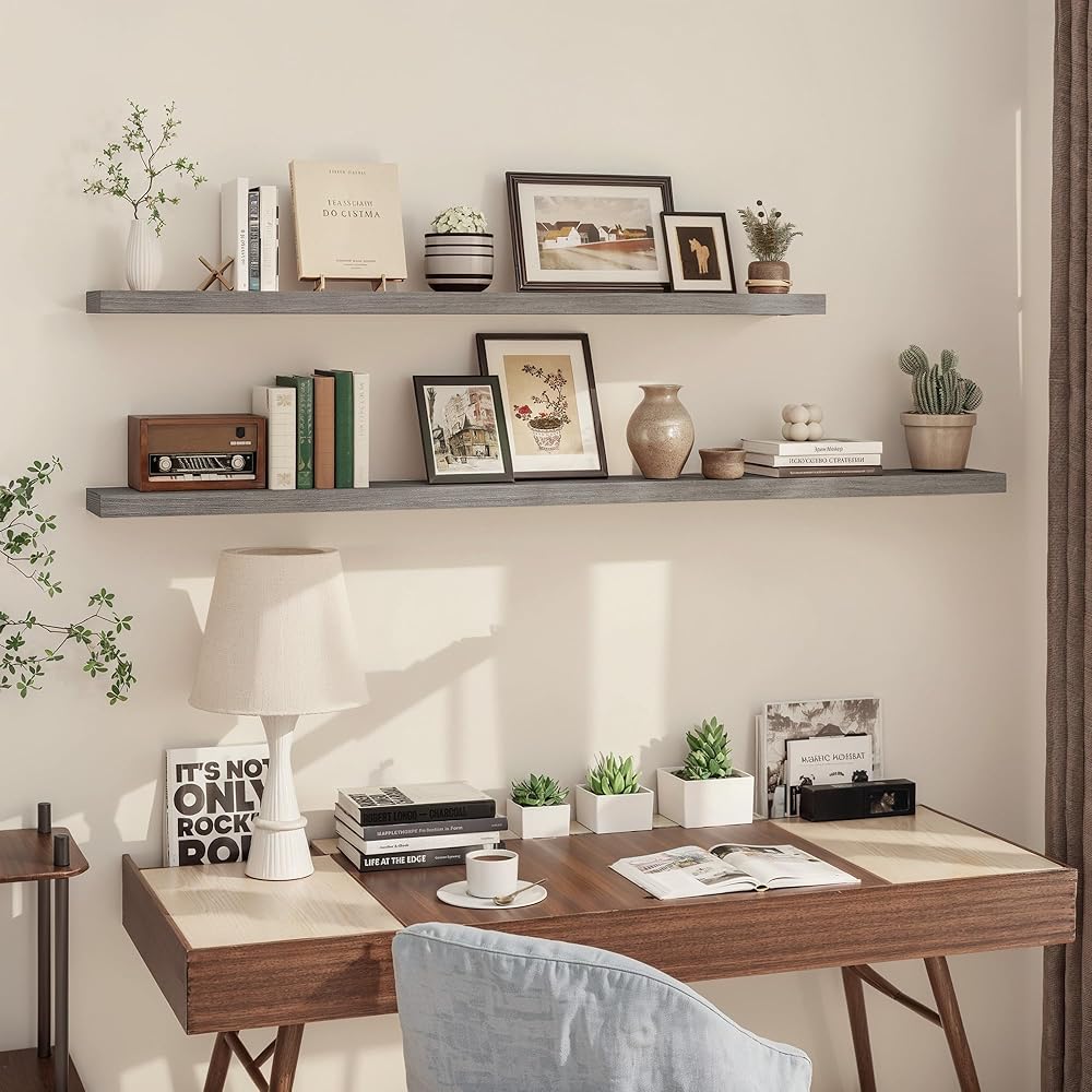 VERSATILE HOME DECOR: These modern floating shelves can be arranged to suit your needs and space. Perfect for bathrooms, bedrooms, kitchens, living rooms, and offices, they beautifully showcase books, trophies, photos, vases, and other treasures.