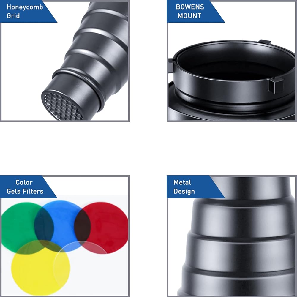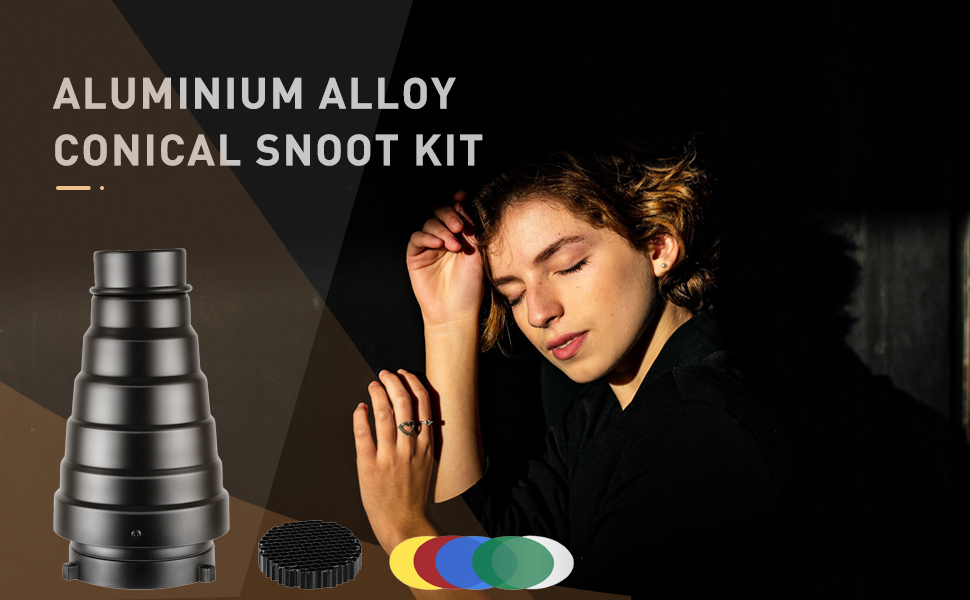 Aluminium Alloy Conical Studio Snoot Kit with 5 Pieces Color Gel Filters and Honeycomb Grid for Bowens Mount Strobe Moonlights Flash Speedlight Photography Light