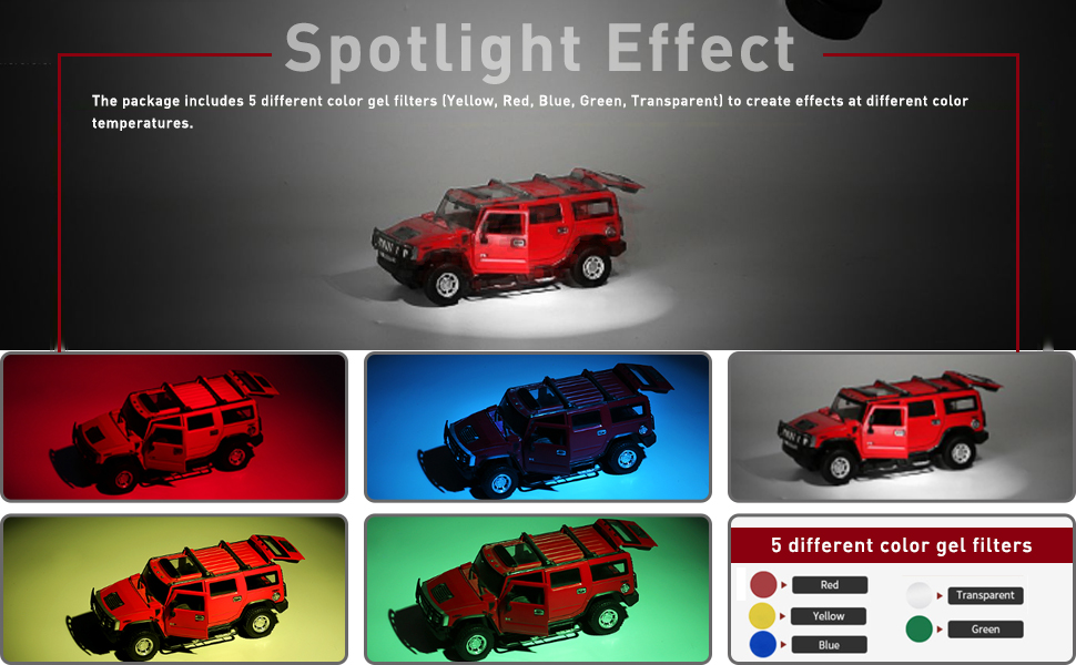 5 GEL FILTERS(Transparent, red, green, blue and yellow) create effects at different color temperatures.