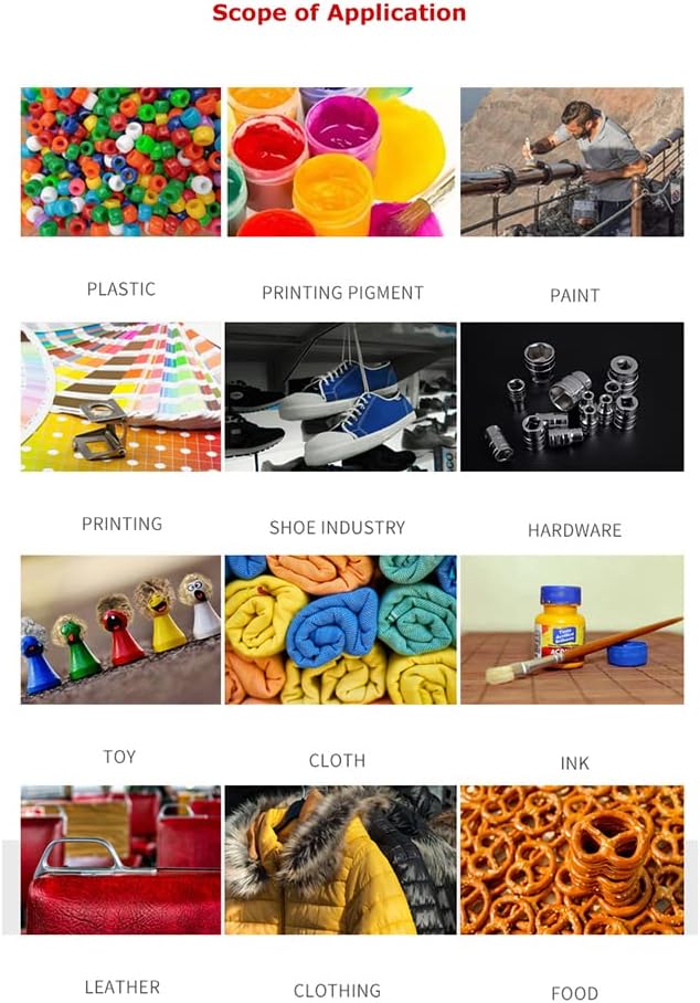 Widely used in textiles, toys, printing, plastics, paint, ink, printing, paints, chemicals, ceramics, footwear, leather, metal, food, cosmetics multi-industry.