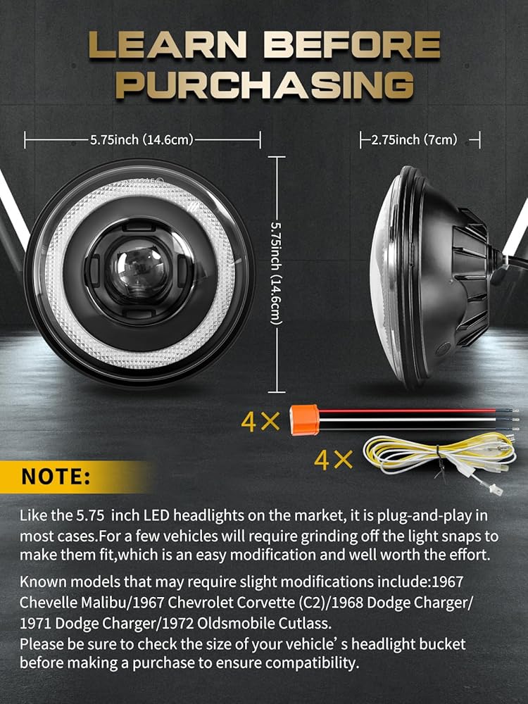 Compatibility1: 5.75 round led headlights Compatible with Dodge Monaco1965-1976;Compatible with Dodge Challenger 1970-1974;Compatible with Peterbilt 352 359; Compatible with Kenworth W900a;Compatible with Ford Gran Torino 1974;Cadillac DeVille 1962-1974; Lincoln Continental 1962-1979;Chrysler Town & Country 1962-1977; Gran Torino 1974