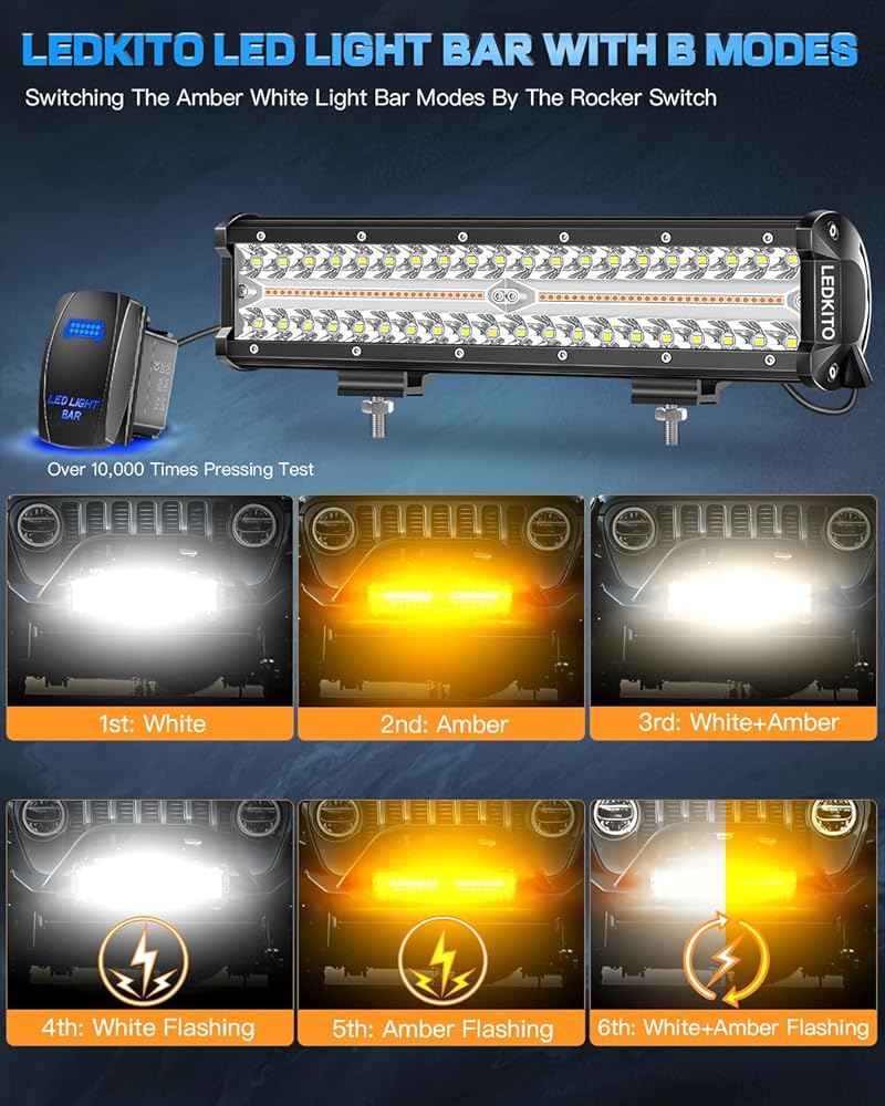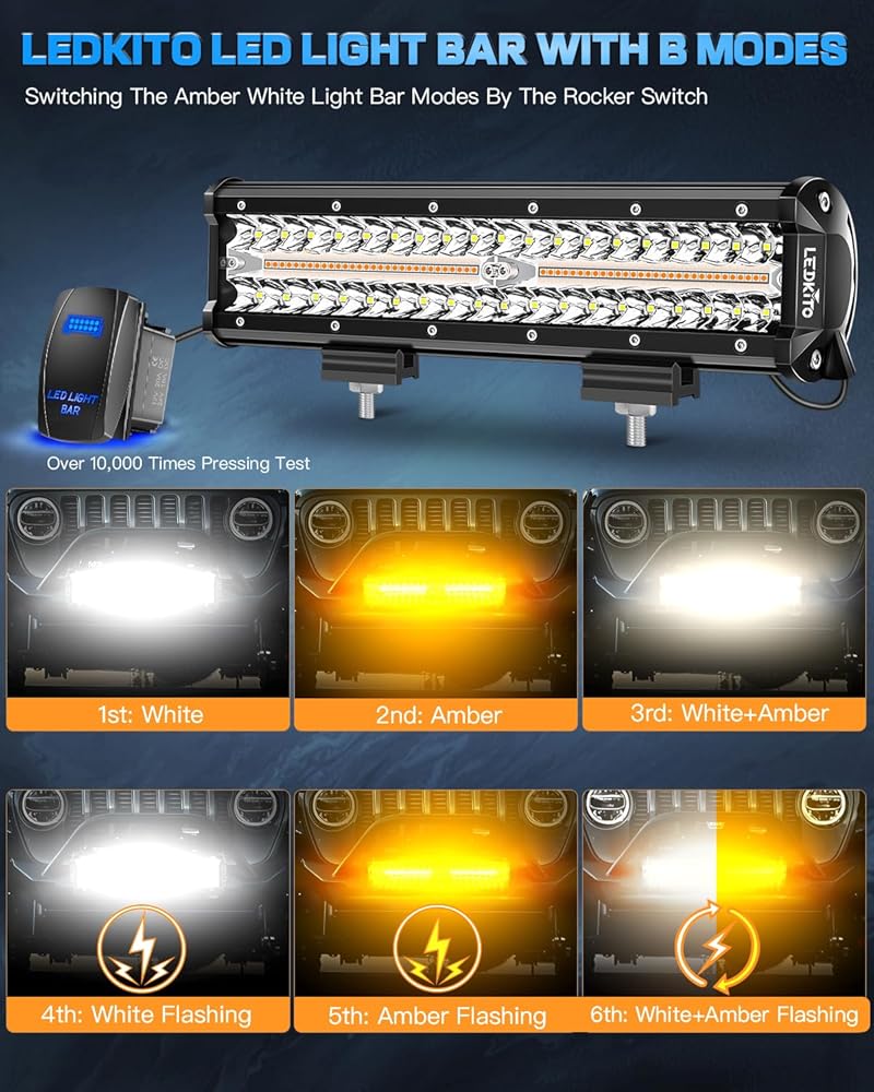 12 inch LED Light Bar Kit Amber White 6 Modes Strobe Off Road Spot Flood Combo Dual Color LED Bar Flashing Emergency Off-Road Light with Rocker Switch Wiring Harness Kit