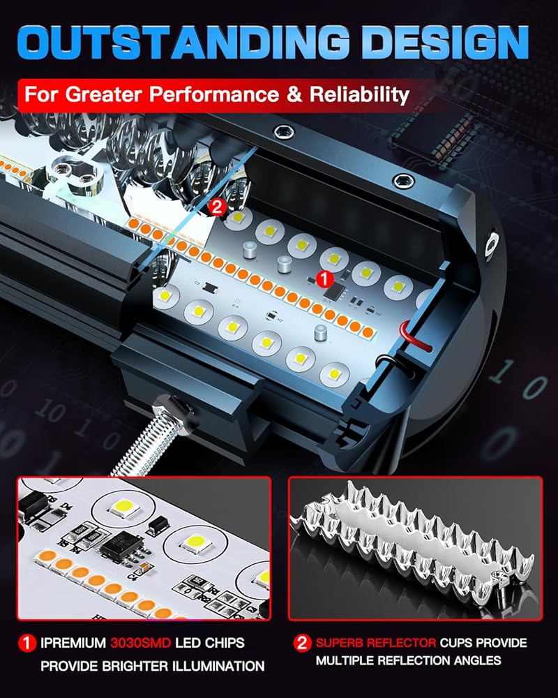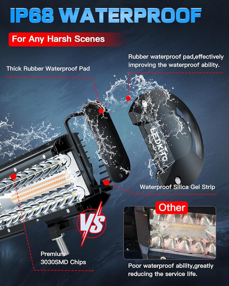 【Super Waterproof Performance】Our 12 inch LED Off Road Driving Light Bar are designed to be super waterproof properties.Be Filled Full With IP68 Glue Layer Into Lights Body,Which Seal Rubber Waterproof Ring At Front Len.Waterproof level reaches IP68 and rustproof,dust-proof,shock-proof,quake-proof.No matter it's stormy,rainy or snowy which effectively resist variable and severe weather.These features enhance the lifespan of the LED light bar up to 80000 Hours.