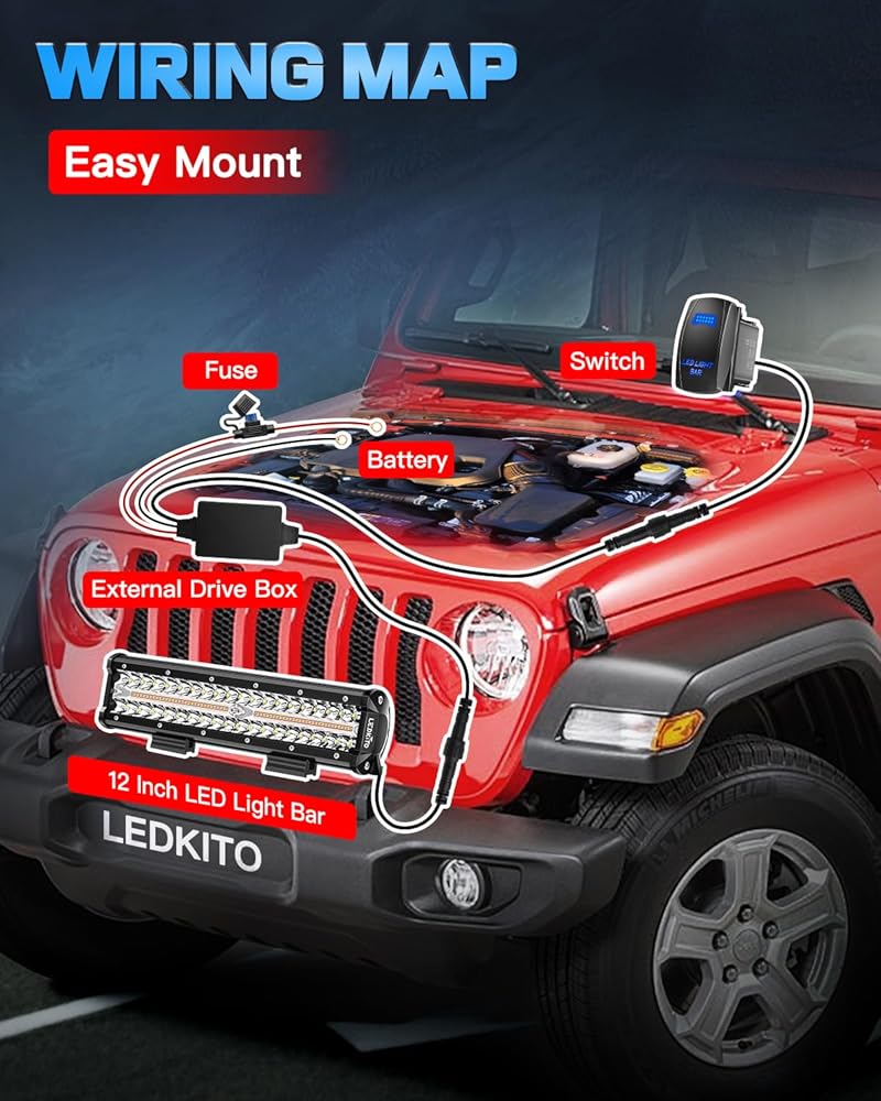 【High Quality Harness Kit】LEDKITO 12inch LED Light Bar kit come with 12ft 5 Pin Rocker Switch Wiring Harness with fuse and relay made of flexible strand copper wire harness.it is wrapped by a thermoplastic jacket that insulates up to 105℃,30A Inline blade fuse & DC 12V 40A Power Relay,Rubber protected replaceable relay and fuse,multiple safety protection.You can freely turn on/off light with simply a press on the illuminated 5 Pin rocker switch. Please pay attention to keep the wiring harness away from electro-heat equipment (engine and etc.)