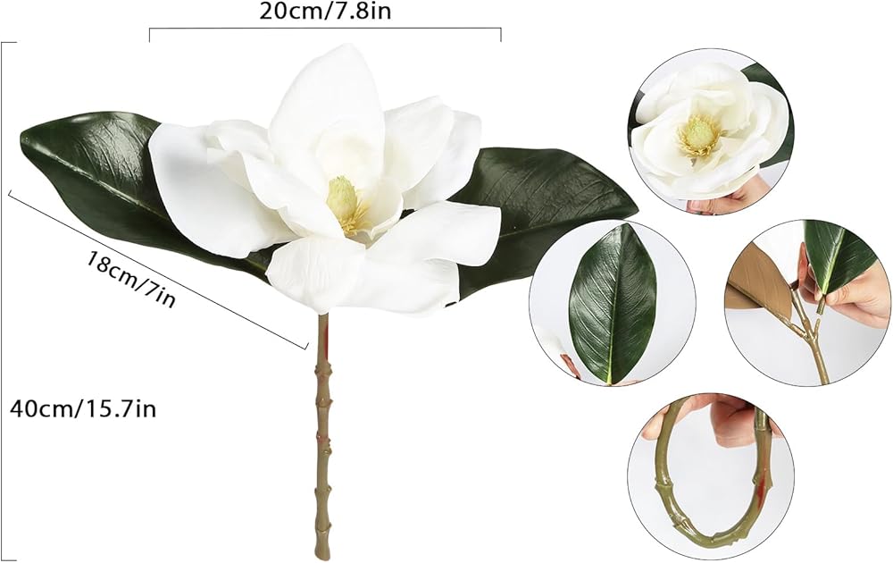 What You Get: The fake flower package include white silk magnolia flowers 1pcs + 4pcs artificial olive branches, the magnolia stems is 28"/ 71cm height, each faux magnolia stems with 3pcs large magnolia flowers heads, the head flower bloom size 5.5"/14cm, the olive branches is 30"/77cm length, long stem artificial flowers combo set for tall vase is great for silk flowers for home decor indoor