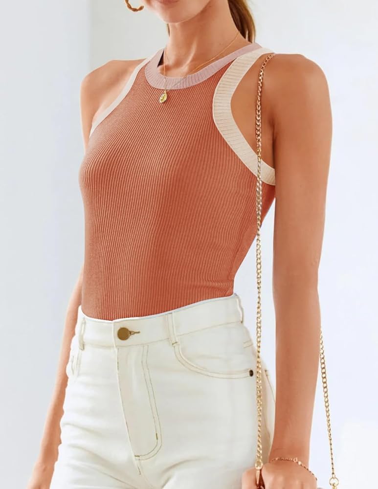 Features: Sleeveless tops, high neck tank top, color block/solid color, racerback, slim fit, ribbed knit, fashion and casual cami tank top.