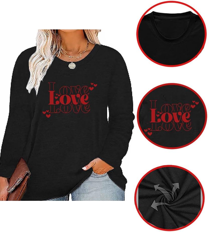 Features: Love Heart Plus Size Shirt, Cute Valentine's Day Graphic Tees 1x 2x 3x 4x, Long Sleeve, O-Neck Tops Blouse for Girlfriend Wife Female Friends.