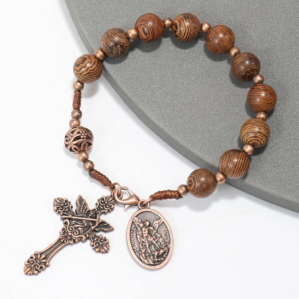 The Wood Beads One Decade Rosary Bracelet is a practical and meaningful accessory. Made with 10mm olive wood beads, this bracelet is durable and unique. It measures 7.5 cm in diameter and 21 cm in length, and it weighs just 14.5 grams. This makes it comfortable to wear and easy to carry with you wherever you go.This rosary bracelet can be worn on your wrist or hung on your car mirror. Its compact size and lightweight design make it easy to keep in your pocket, purse, or bag. Whether you are at home, at work, or traveling, this bracelet allows you to carry a reminder of your faith with you at all times. There are three variations of this rosary bracelet, each with special significance. The first variation features a St. Michael medal and cross, symbolizing protection and strength. This is perfect for those seeking a sense of guardianship in their lives. The second variation includes a St. Benedict medal and cross, known for providing spiritual protection and strength. This option is great for those who want to ward off negative influences. The third variation has a Jesus Cross with a St. Joseph medal, representing guidance, support, and fatherly protection. This variation is ideal for those looking for these comforting virtues. Each bracelet is handmade with care, ensuring quality and attention to detail. The olive wood beads are strong and have unique grain patterns, making each bracelet one-of-a-kind. The medals and crosses are also well-made, ensuring they remain beautiful and untarnished over time.This rosary bracelet is a thoughtful gift for many religious occasions, such as confirmations, baptisms, and personal milestones. Its simple design and meaningful symbols make it a cherished keepsake for anyone who receives it. Whether you are giving it as a gift or using it for your own spiritual practice, the Wood Beads One Decade Rosary Bracelet is a wonderful way to keep your faith close.