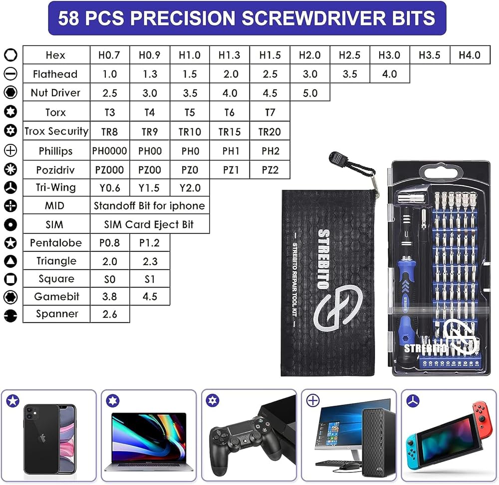 【Effective Toolkit】STREBITO 79 in 1 computer tool kit was professional engineered for maximum utility. It includes 58 screwdriver bits (Torx, Flat Head, Phillips, Star, Hex, Triwing, Pentalobe, Gamebit, etc) and 21 repair tools, such as anti static wristband, flexible screwdriver extension, ultra-thin steel spudger, nylon spudger, tweezers, suction cup with SIM card removal tool, opening tools and opening picks. Complete with all the right tools for your practical repair needs