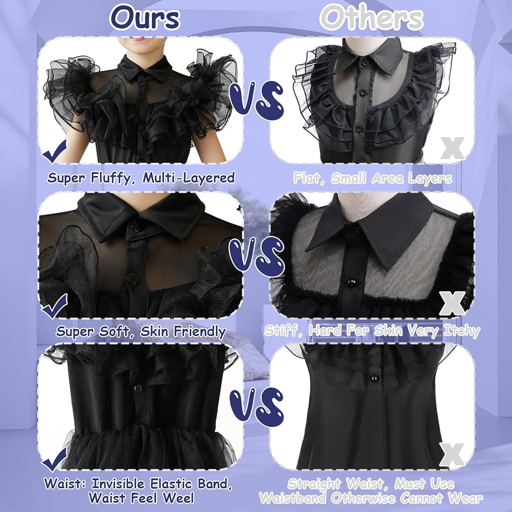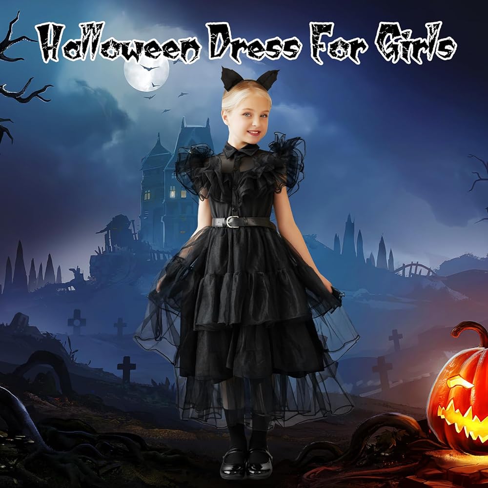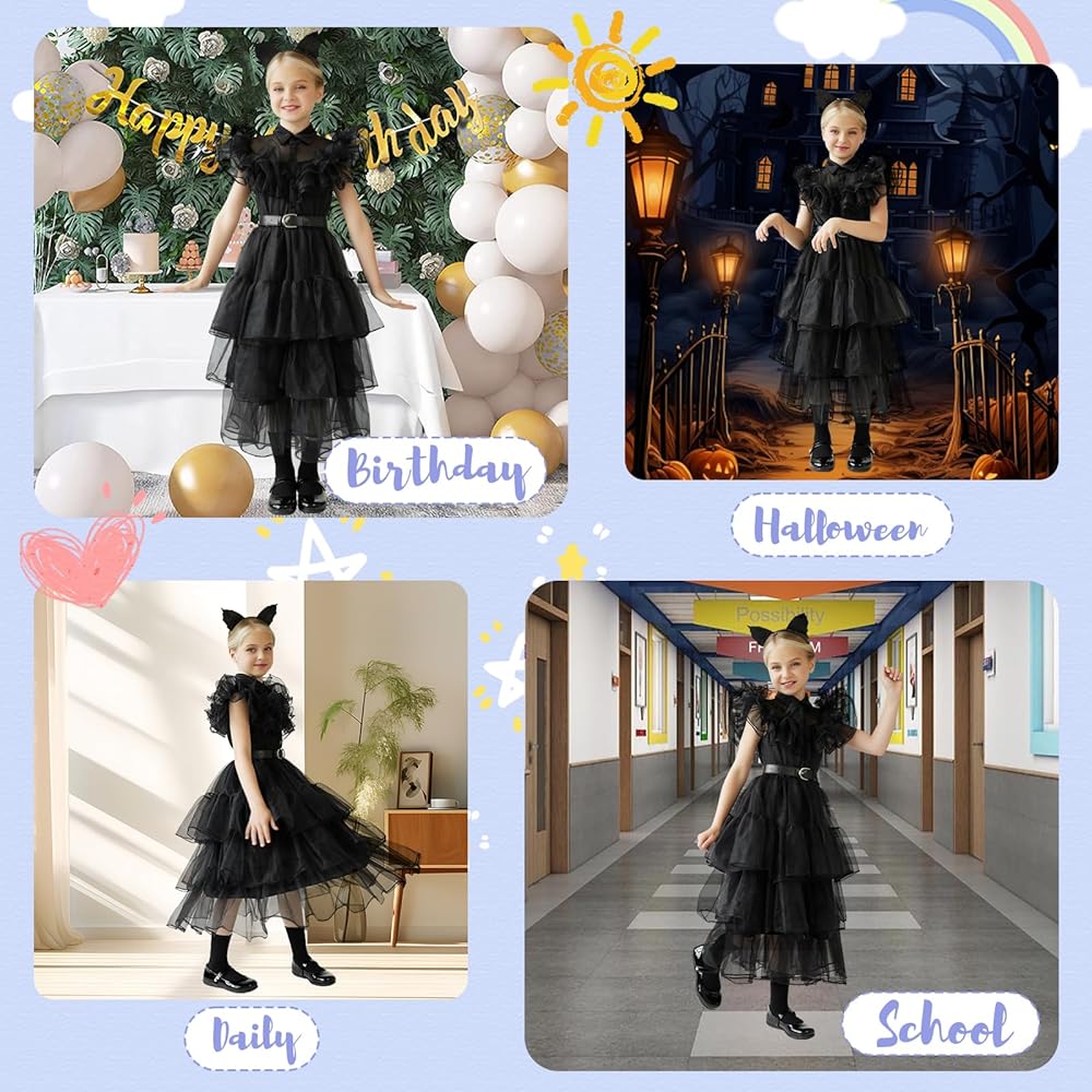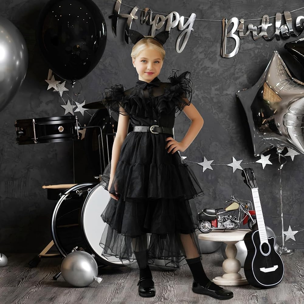 Perfect Gift - The little girl was overjoyed as she received the black dress inspired by the look. She twirled around in excitement, feeling like a dark and mysterious princess. The costume girls dress made her feel confident and powerful, as if she could conquer anything.