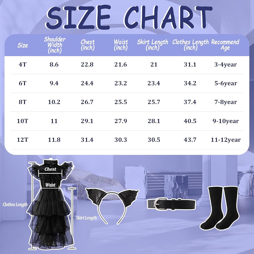 Size & Package Included: 1*Black tutu Dress, 1*Belt, 1* pair of socks, Kids family Costume For girls aged 4-12 years. Before buying, please see the size chart in the picture or description for details. Please feel free to contact us by email with any questions.