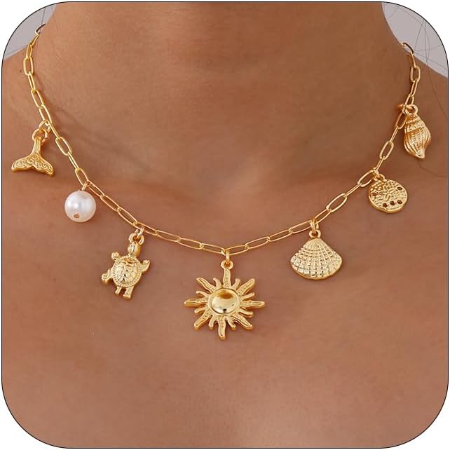 Charm Necklace: Allow your style to embrace the ocean and flow through the golden waves on summer days. The paperclip chain is adorned with various delightful pendants of starfish, shells, conchs, suns, and turtles, each one captivating and the ideal accessory for your leisurely walks on picturesque beaches.
