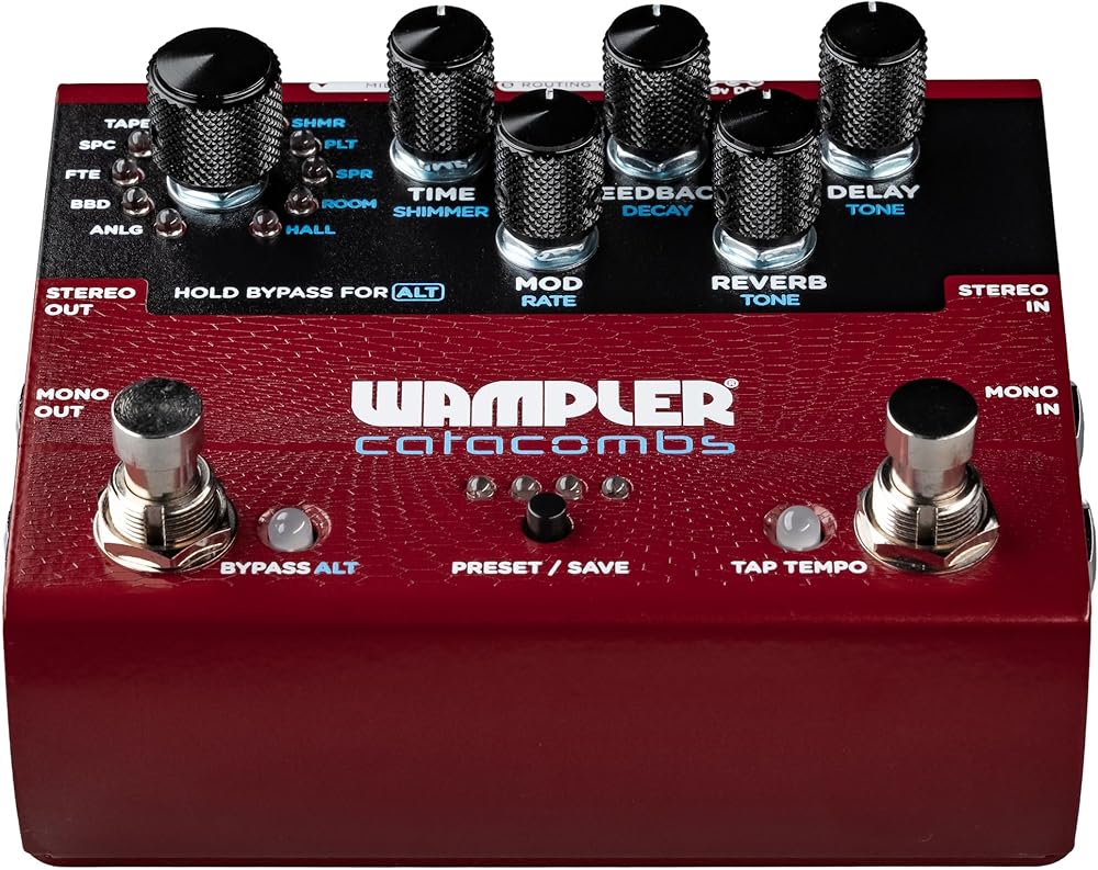 The Wampler Catacombs is a programmable, all-in-one delay and reverb pedal that redefines your relationship with time-based effects. Ever since Brian Wampler first picked up a guitar, he's been chasing the perfect sound - a quest that led him to build pedals in the first place. One challenge kept coming up, both for him and the countless musicians he's talked to: the struggle to have a wide range of sounds with complex editing capabilities while keeping the pedal interface manageable. Musicians either compromise on versatility or sacrifice precious space. Brian knew there had to be a better way. That's why he created the Catacombs - a pedal that eliminates the compromise altogether. It packs 11 of the most popular delay and reverb sounds into one intuitive, powerful package. Whether you're after a trusty digital delay and a plate reverb or a musical shimmer and a spaced out echo we have you covered!