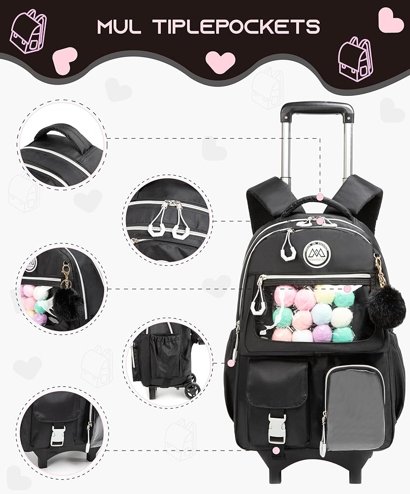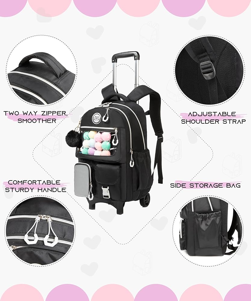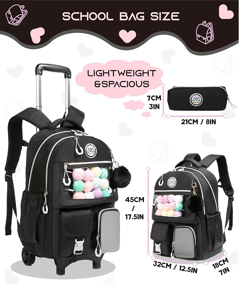 ♥ Rolling Backpack For Girls: The backpack with wheels for girls is based on a solid color, and the bag pocket is covered with shiny material, unique design and beautiful appearance. This backpack for girls offers plenty of storage space and comes with many functional pockets, lunch bags and pencil cases.