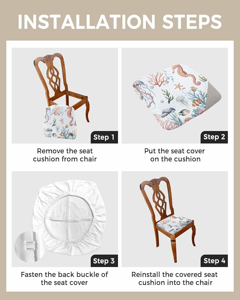 • 【Easy To Care】Chair seat covers protector have elastic strap buttons on the back for easy installation and removal. If you only need to clean part of chair seat cover for dining chair, just wipe it with a damp towel. If chair seat cover is used for a period of time, can also be washed in the washing machine. Please do not bleach chair cushion covers for dining chairs. Don't fade. Hang dry naturally or tumble dry. Ironing at low temperature will bring better visual effects.