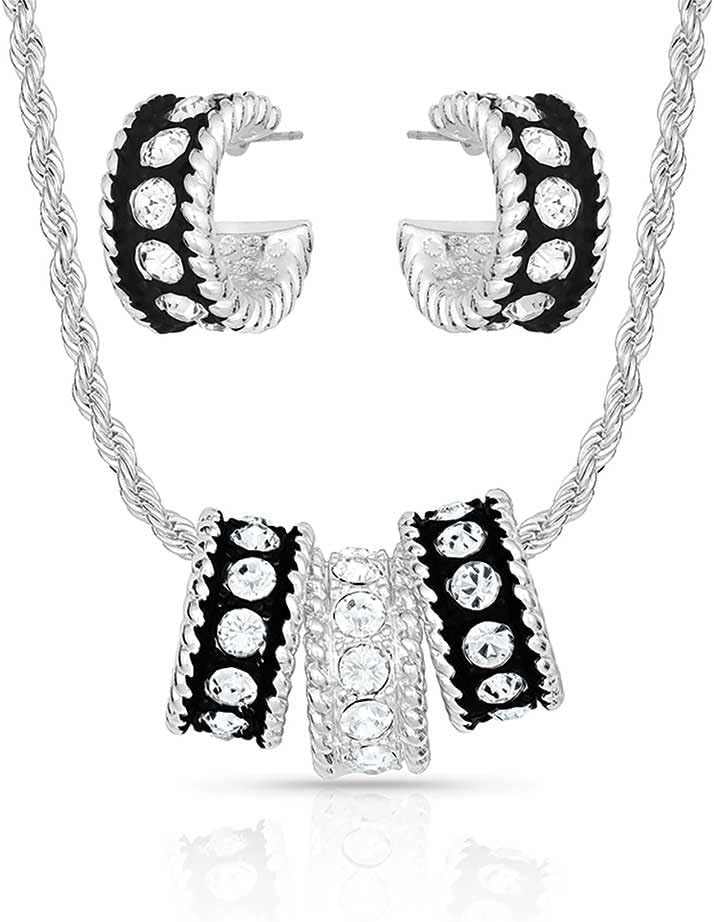 Womens Montana Silversmiths Jewelry Set: Ladies Montana Silversmiths Western Jewelry Set. Delicate and sparkling, the women's Falling Petals Crystal Jewelry Set will add elegance and glamour to your look. The stunning design of the necklace and earrings features gorgeous clear cubic zirconia crystals that cascade down like the falling petals of a flower or a cascading waterfall. The necklace makes a subtle statement and hangs from an 18 inch silver tone chain. The matching earrings are secured by a hypoallergenic stainless steel post wire for a seamless and cohesive look. Rhodium over brass. You can maintain your silver brilliance with an occasional wipe of a damp cloth. DO NOT use chemical or abrasive cleaners. JS5643