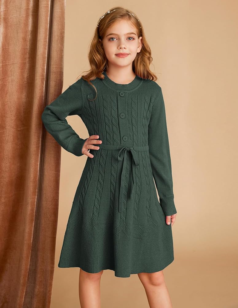 EXQUISITE DESIGN: 2024 girls fall winter dress features a partially cable-knitted pattern, long sleeves, decorative buttons on the front bodice, adjustable drawstring waist, and an A-line silhouette for an elegant look.