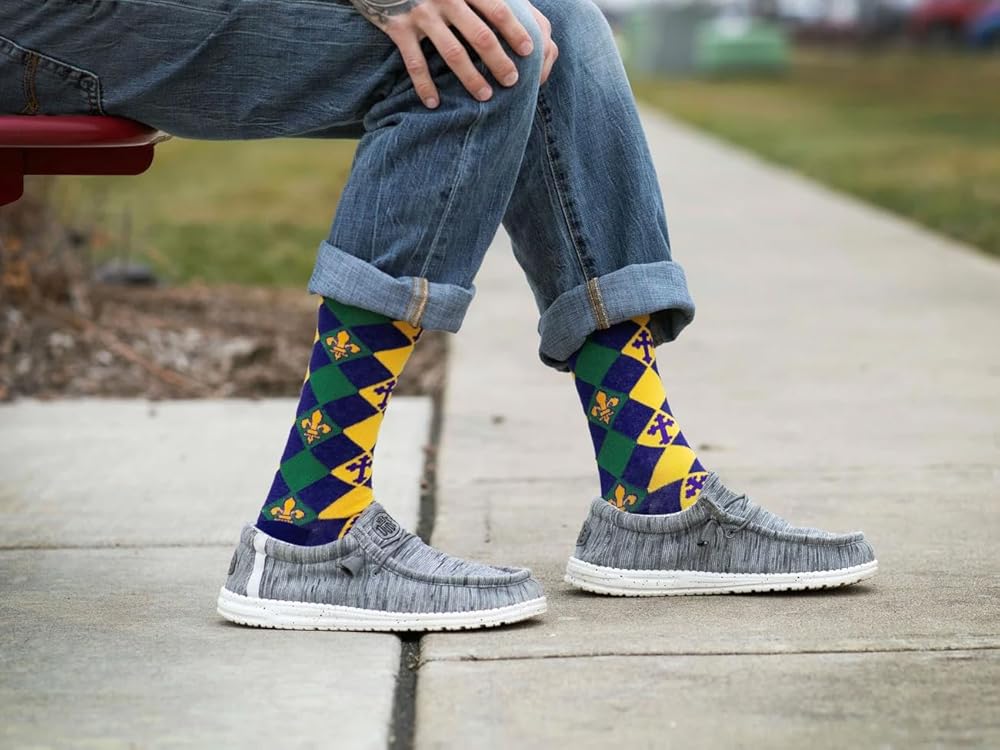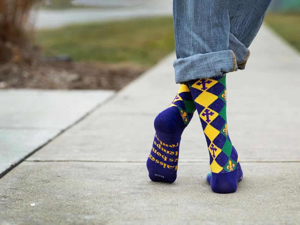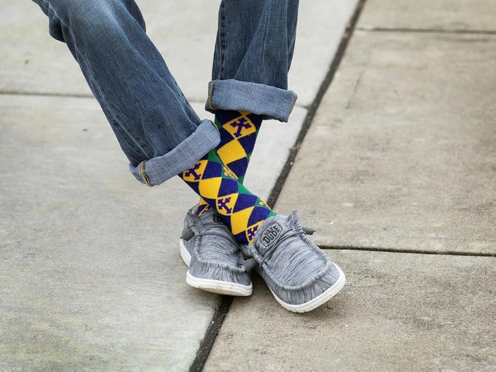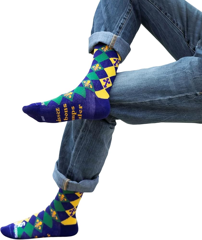 Mardi Gras, known as "Fat Tuesday," marks a vibrant season of revelry before the solemn observance of Lent; Socks features a lively harlequin pattern in the traditional Mardi Gras colors—purple symbolizing justice, green for faith, and yellow representing power—reflecting the underlying themes of penance and the rewards of virtuous deeds